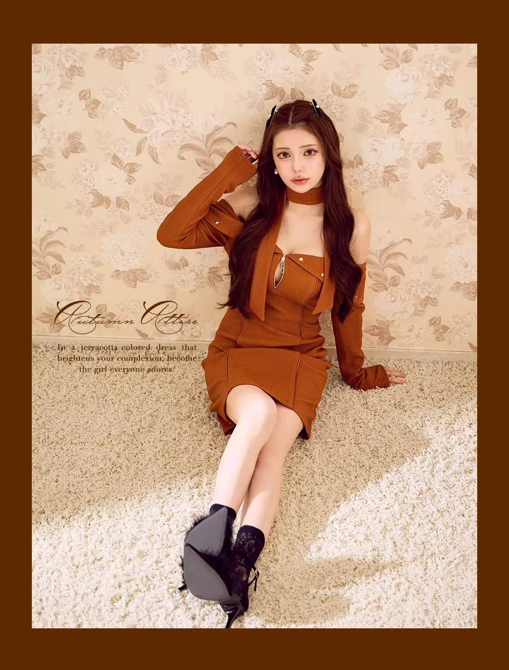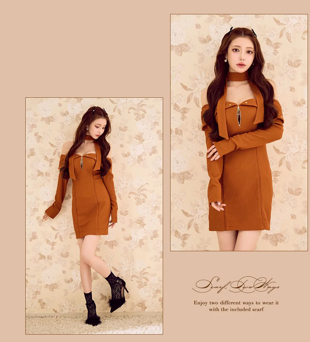 オフショルで華奢なデコルテを魅せる長袖ドレス。