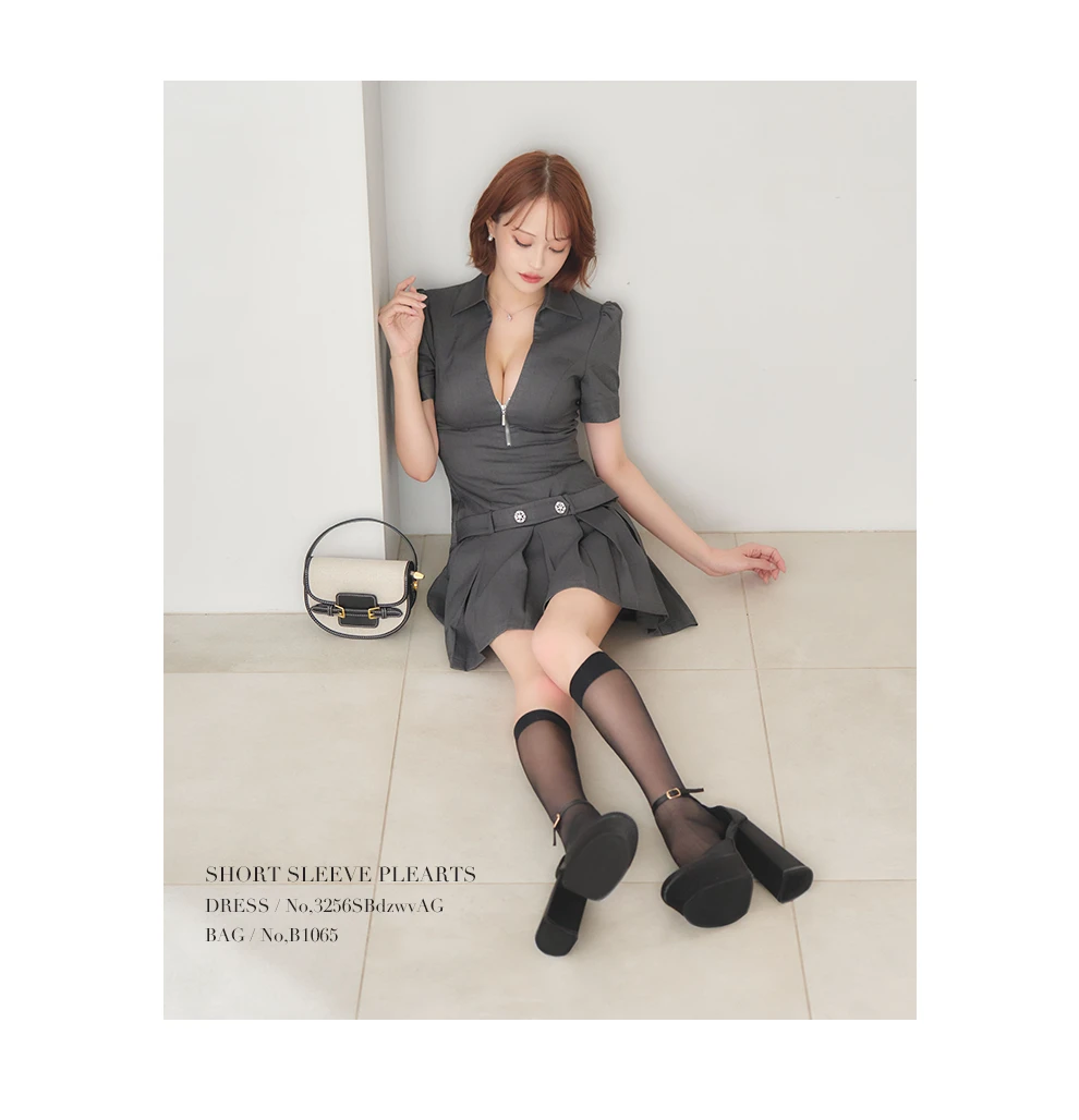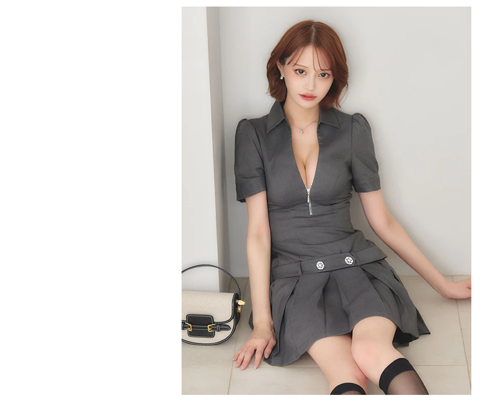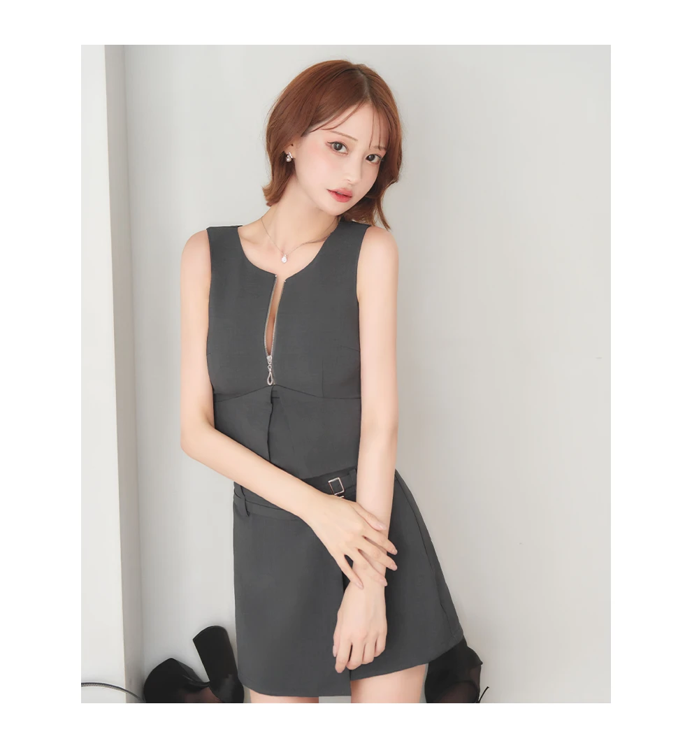 大胆な胸元ジップとフォーマルな襟付きデザインのバランスが◎