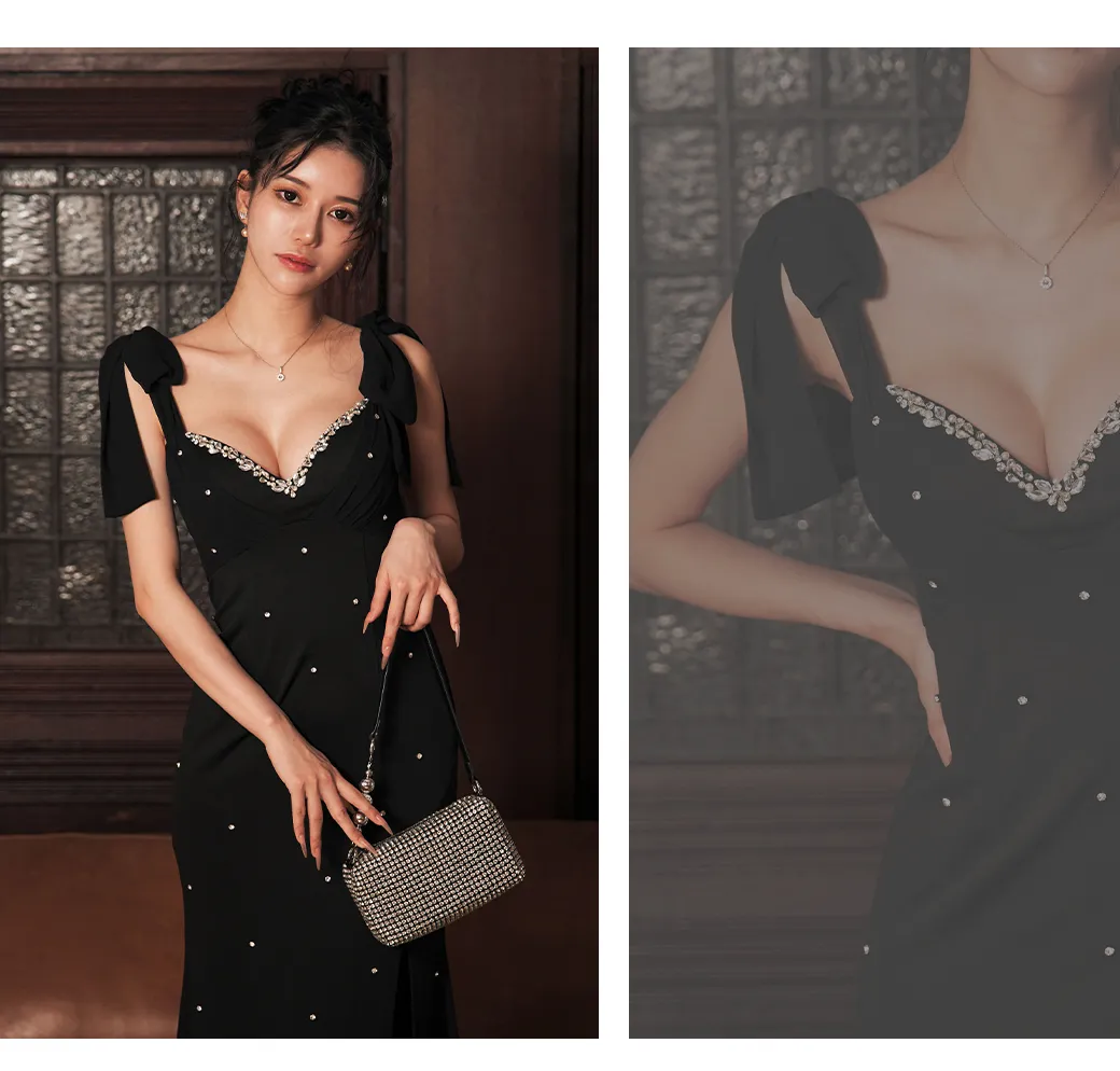 視線を引き寄せる谷間見せキャミソールデザインのロングドレス。