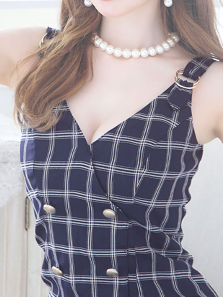 SALE!チェック柄タイトミニドレス/ダブルボタン/ノースリーブ/金ボタン/谷間見せ/背中見せ/ミニドレス/キャバドレス 【S-Mサイズ/1カラー】[HC02] 【SB】dzw [2181SBdzw-230724-2]