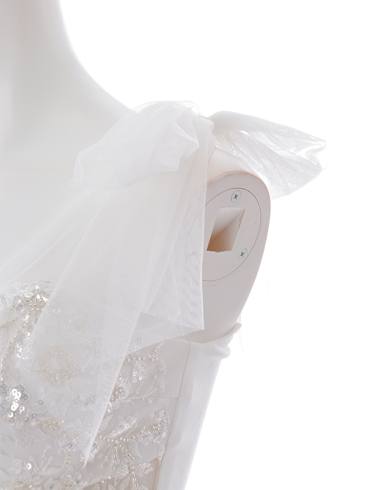 肩にあしらわれた大きなチュールリボンが、顔周りをドラマティックに華やかせます。