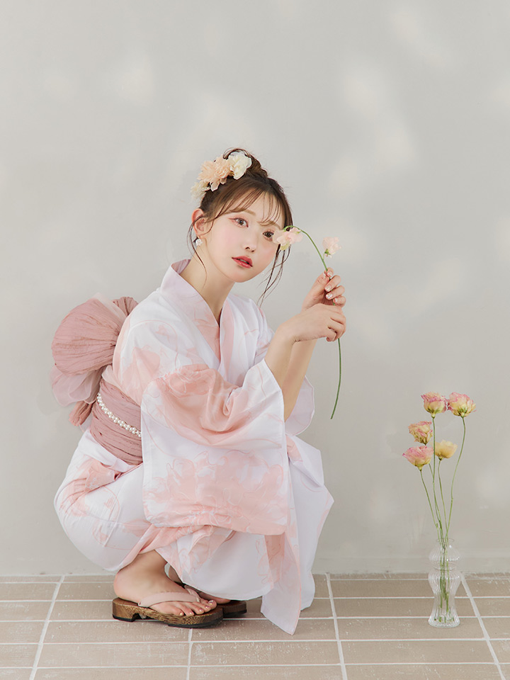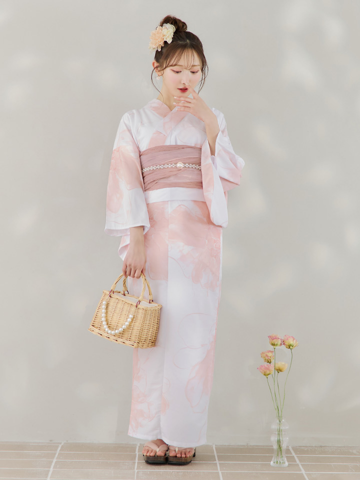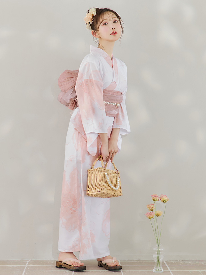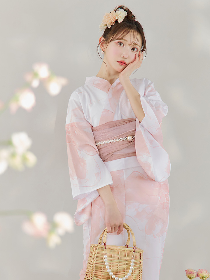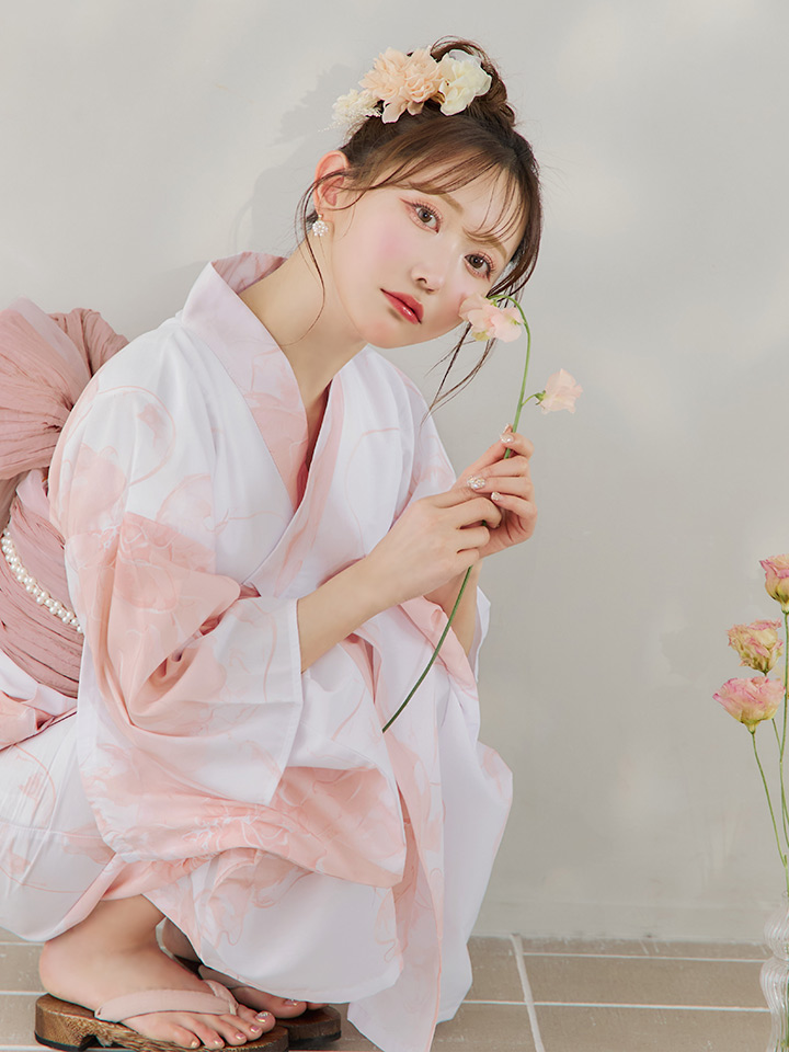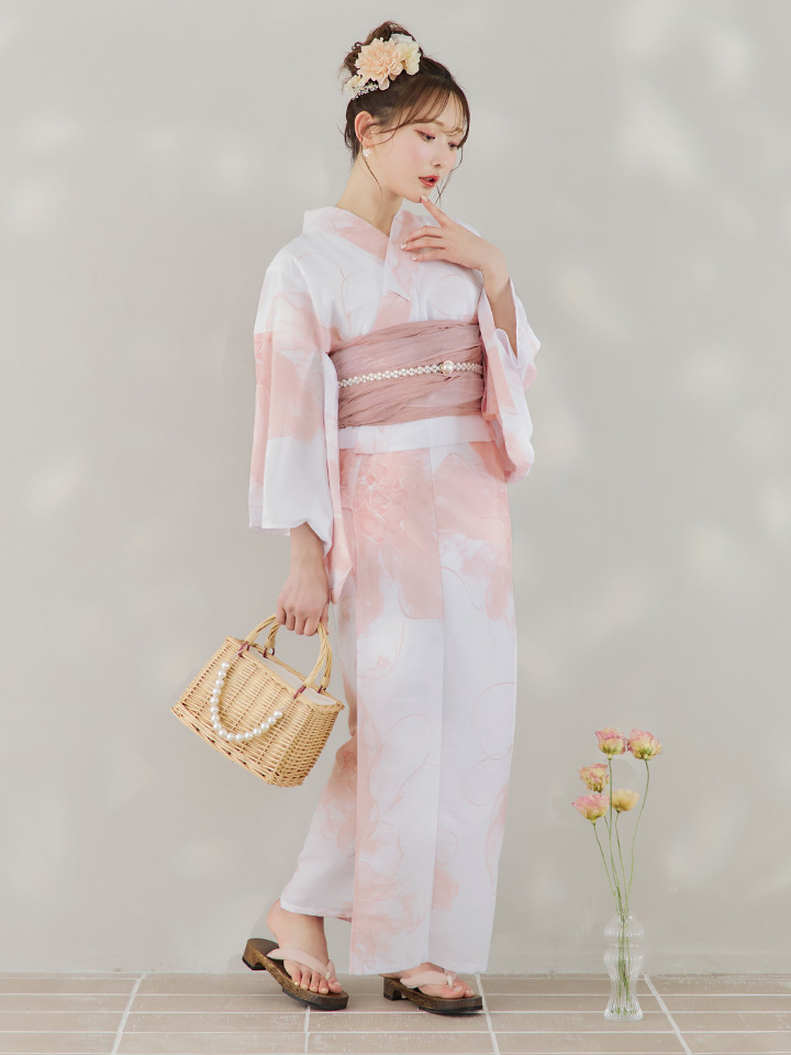 白地にピンクの組み合わせでほんのり甘さをプラスしたニュアンスフラワー浴衣♥