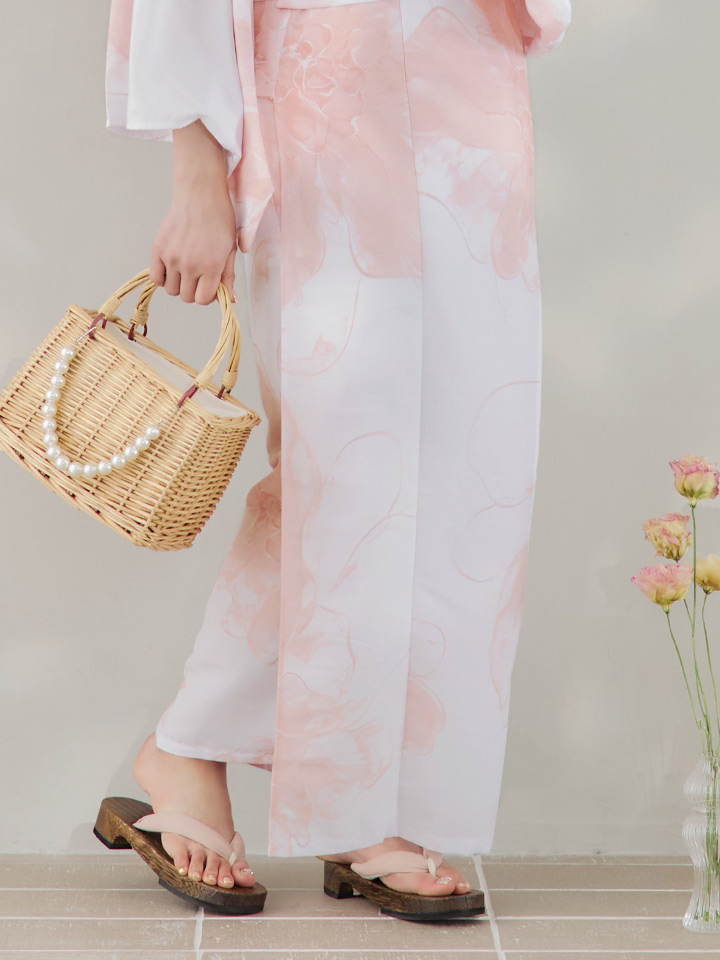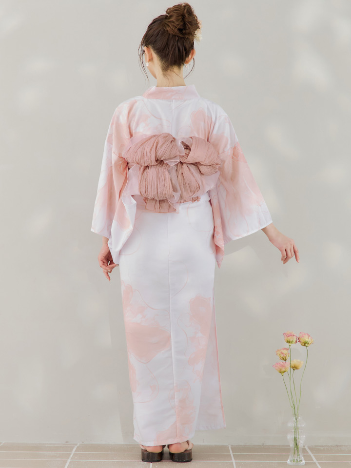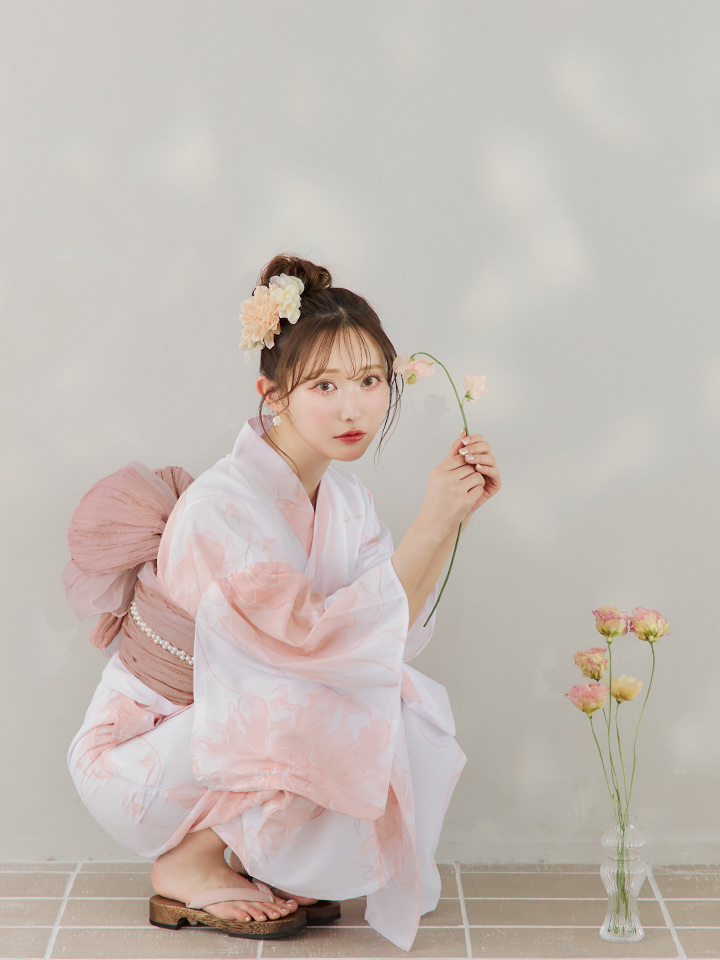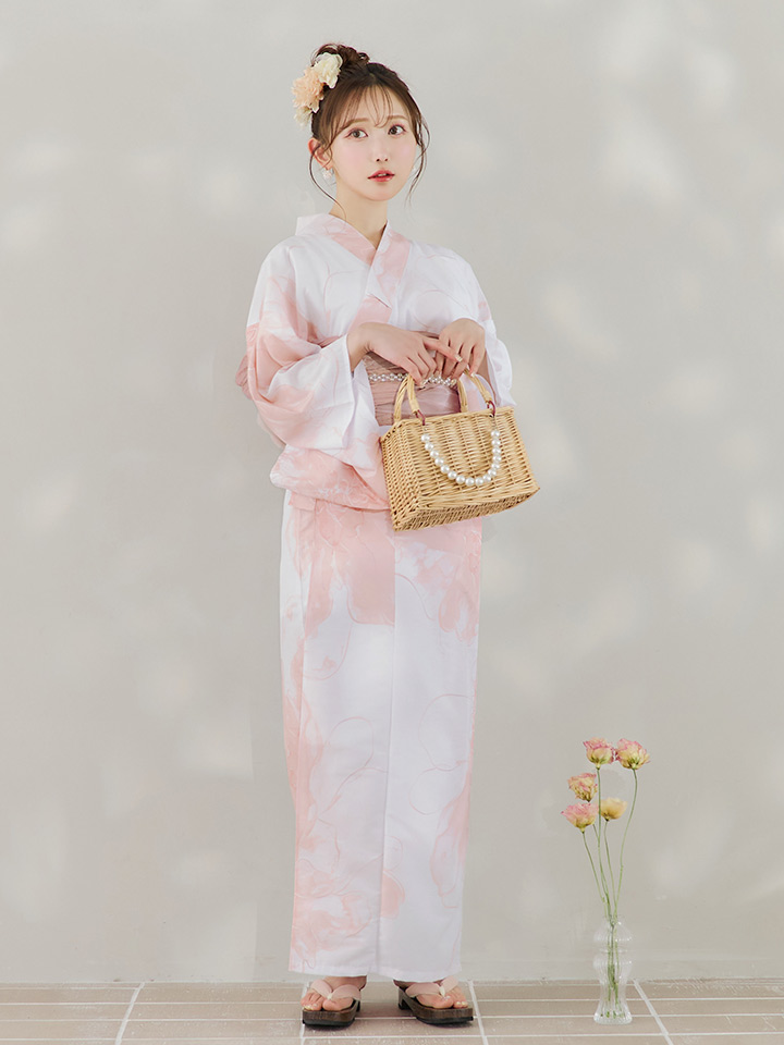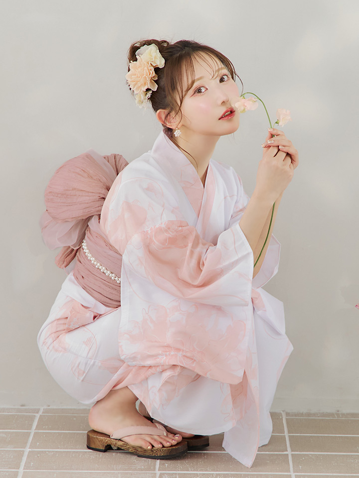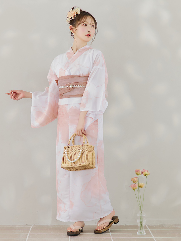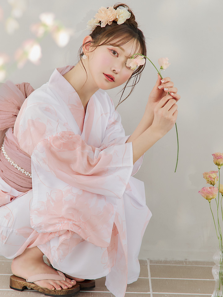 白地にピンクの組み合わせでほんのり甘さをプラスしたニュアンスフラワー浴衣♥