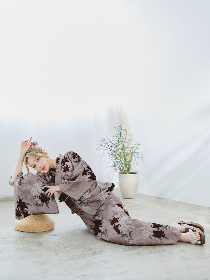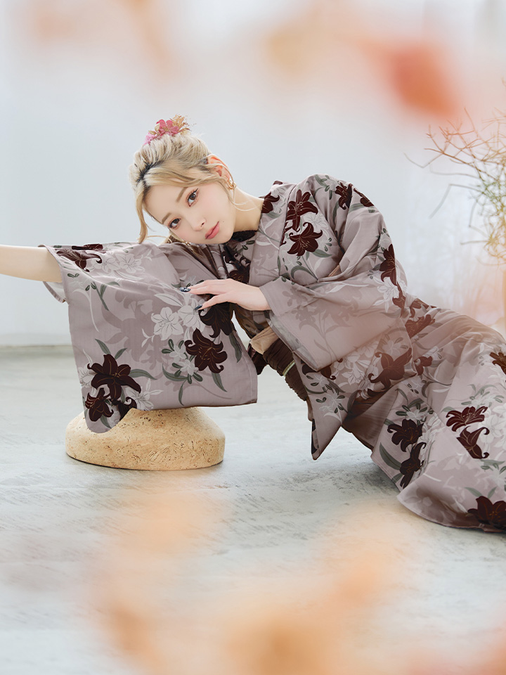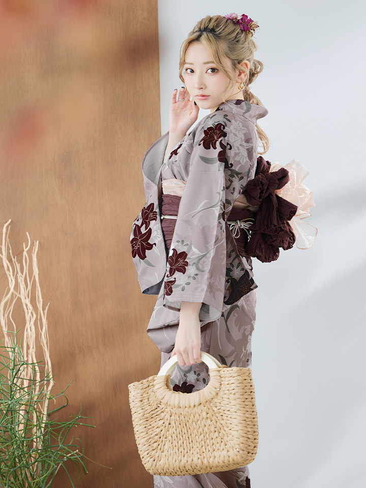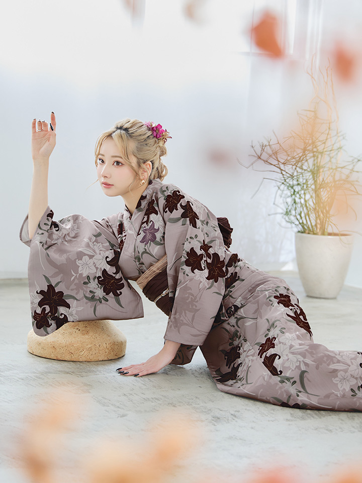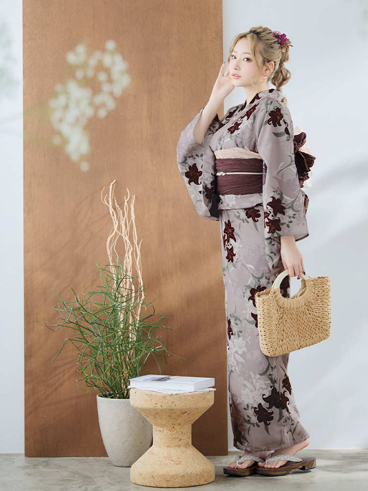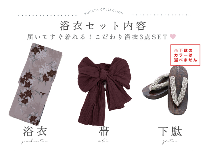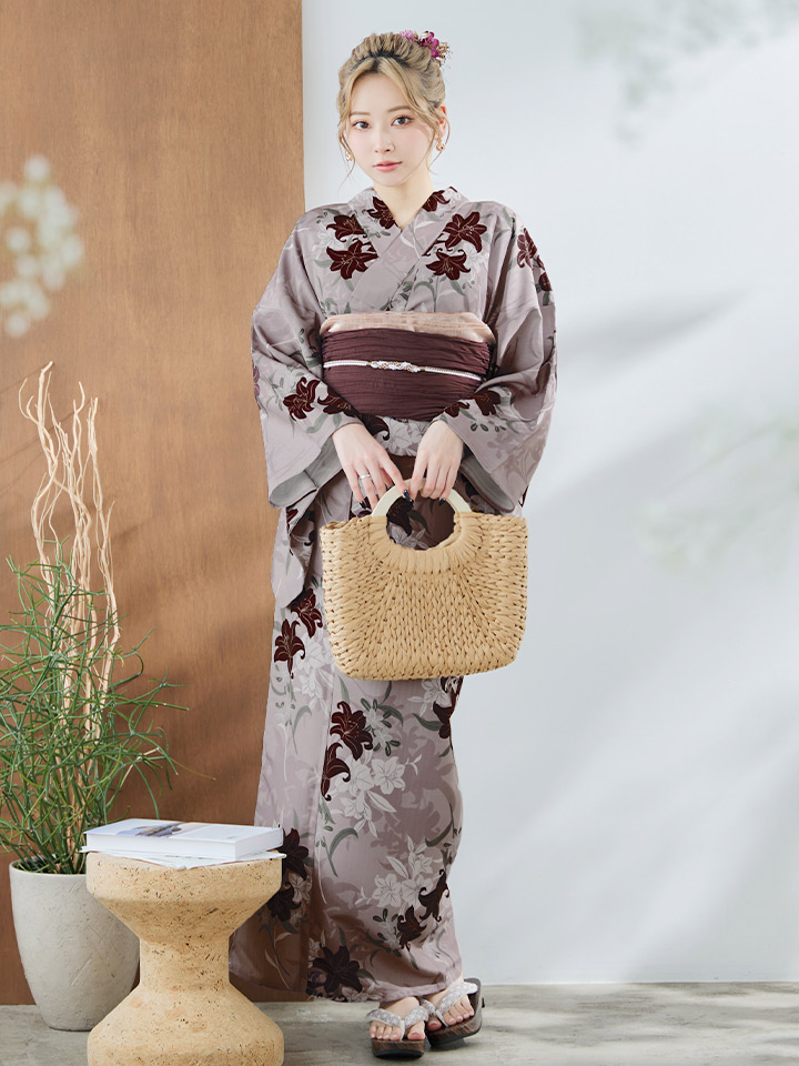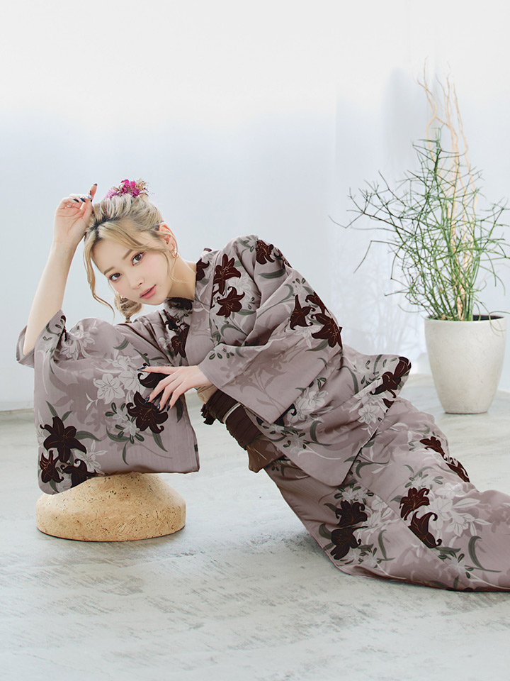 【即日発送】ブラウンパープルリリー浴衣 【浴衣3点セット 浴衣/帯/下駄】[YMT] [Y-8088-ok-BR-F-24PY]