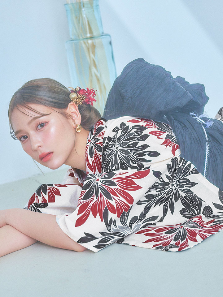 ディープトーンのレッドとネイビーの大柄フラワーデザインが華やかに飾るレトロモダンな1着。