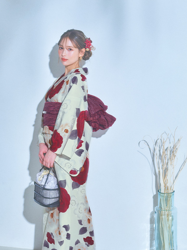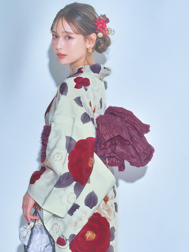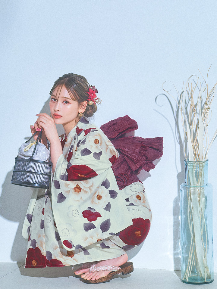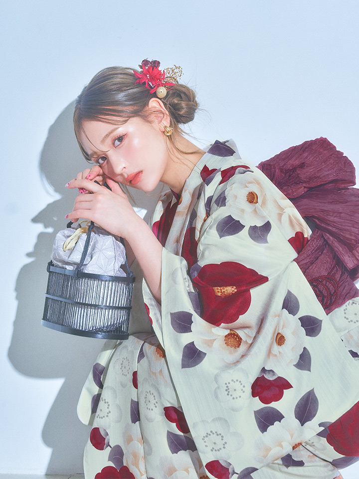 レッドとホワイトのツバキが美しく咲く品のある大正ロマン漂うオシャレ夏浴衣♥
