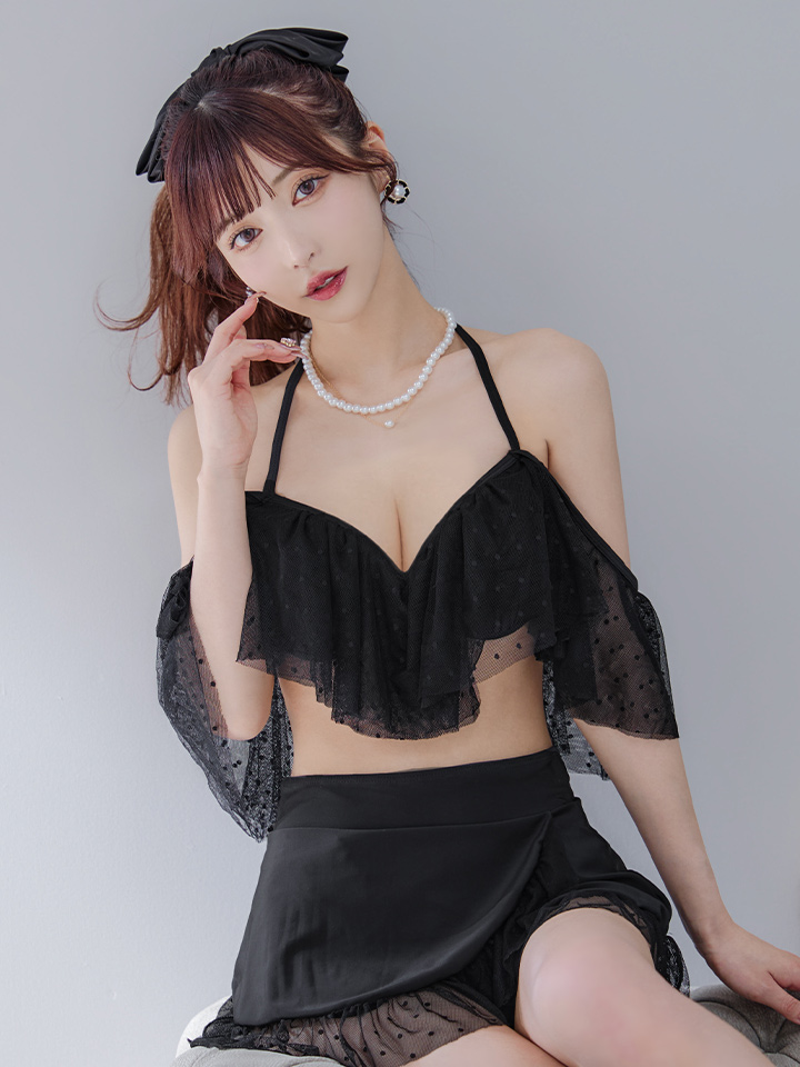 【即日発送】【ビキニ】ドットシアーオフショルスカート付きビキニ 3点セット【水着】[YMT]