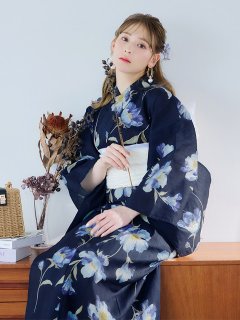 白地にトーンの様々なパープルとネイビーのフラワーが散りばめられた可憐ながらも洗練された印象を残す夏浴衣。