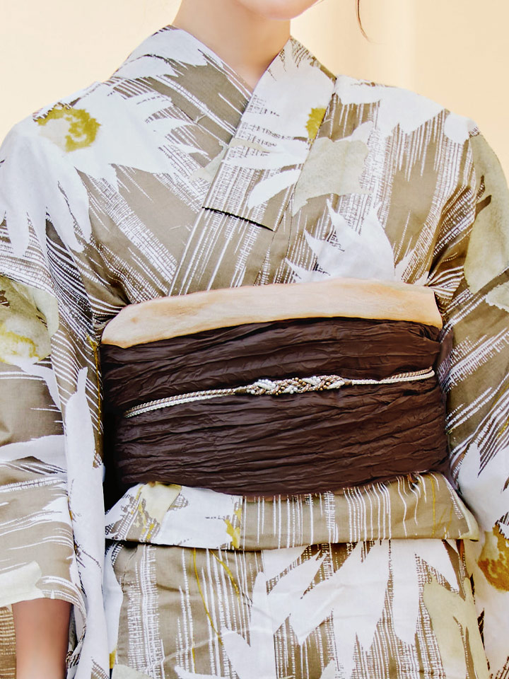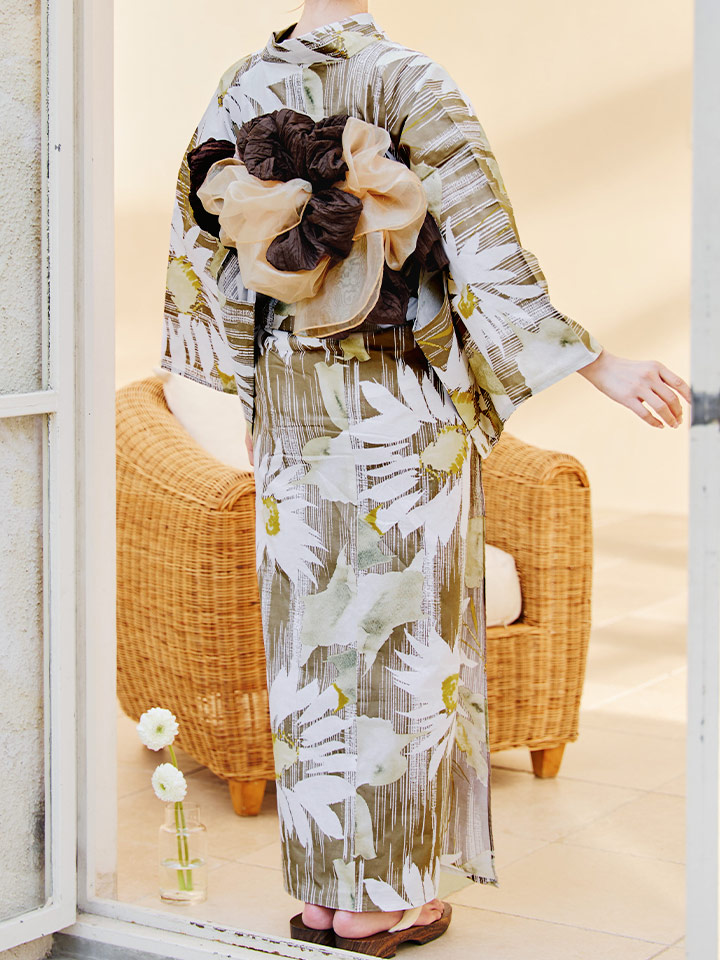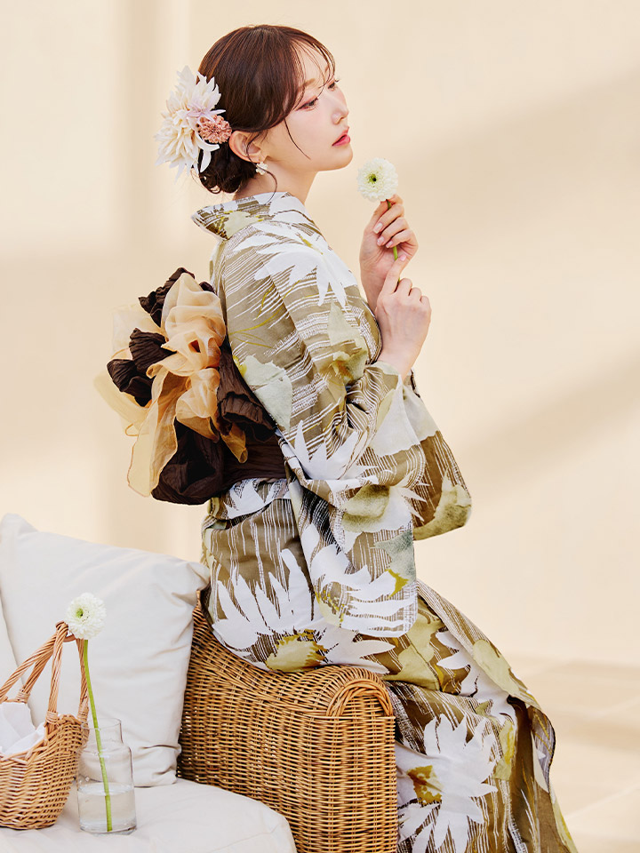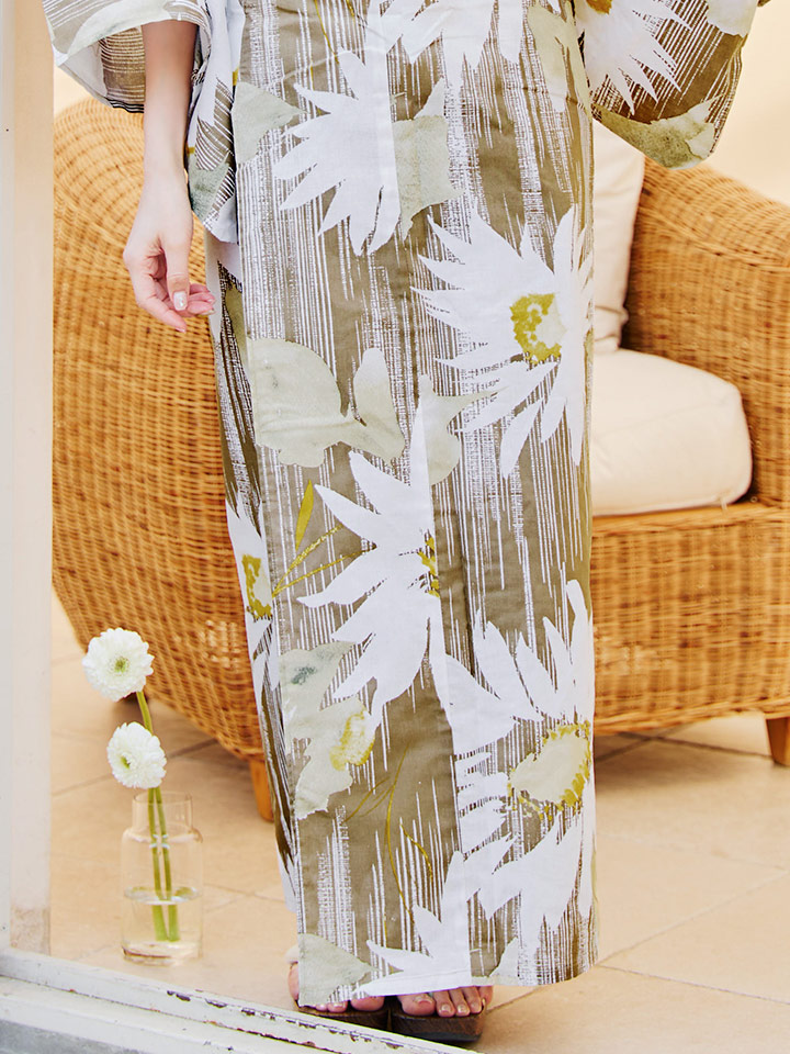 ベージュにグリーンが合わさった大人カラーが今っぽくレトロモダンな夏浴衣♥