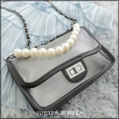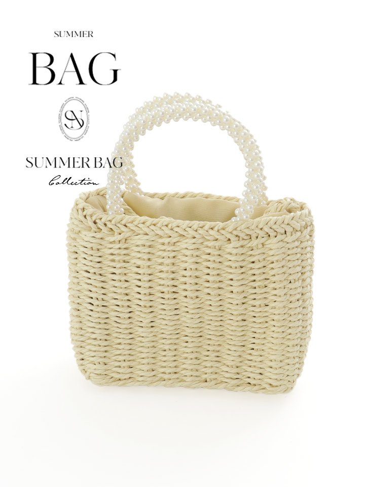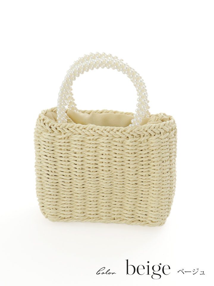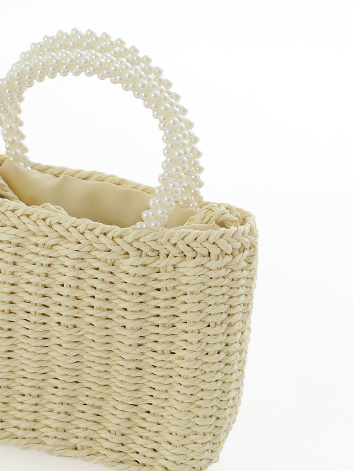 パールのハンドルがアクセサリーライクな編みバッグ。