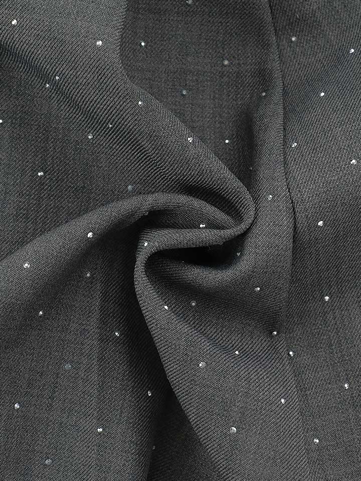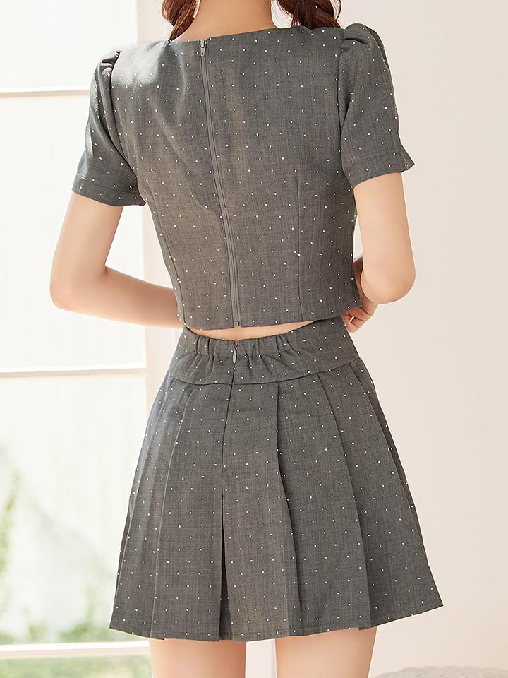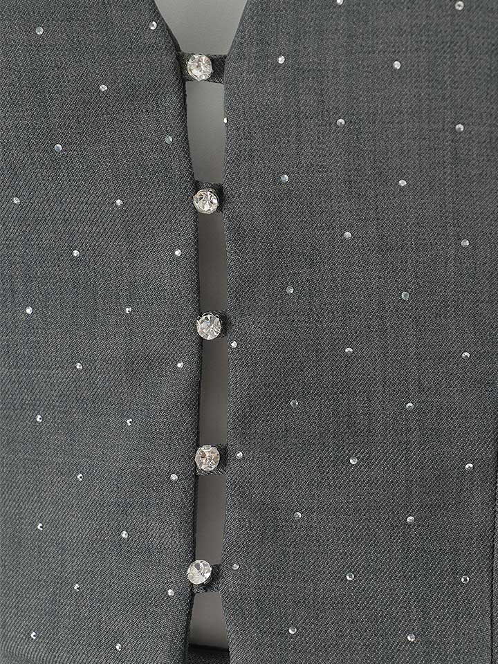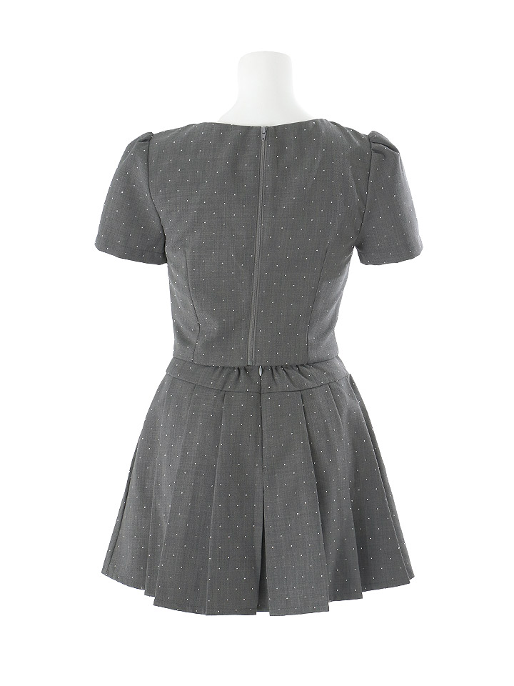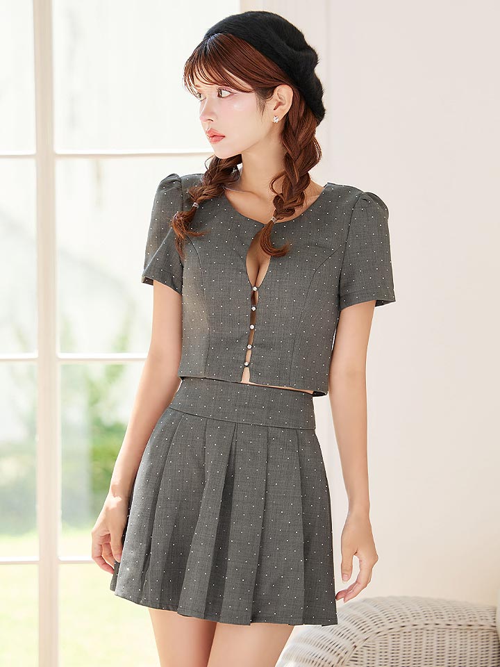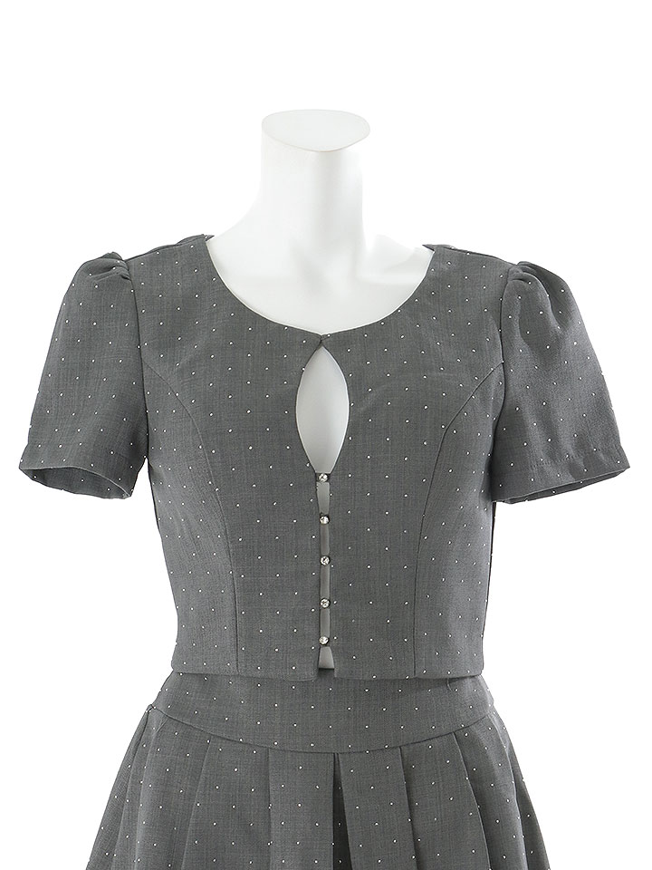胸元にきらっと輝くビジューボタンが華やかさをプラス。