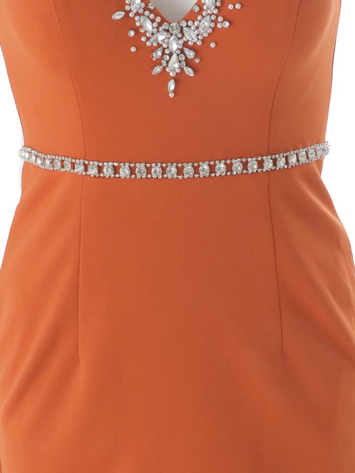 胸元の華やかなビジューとウエストのビジューラインが視線を集め、スタイルを美しく強調。