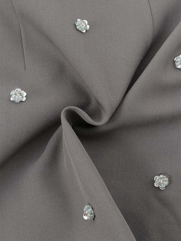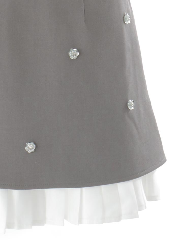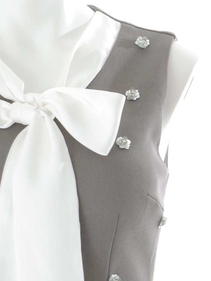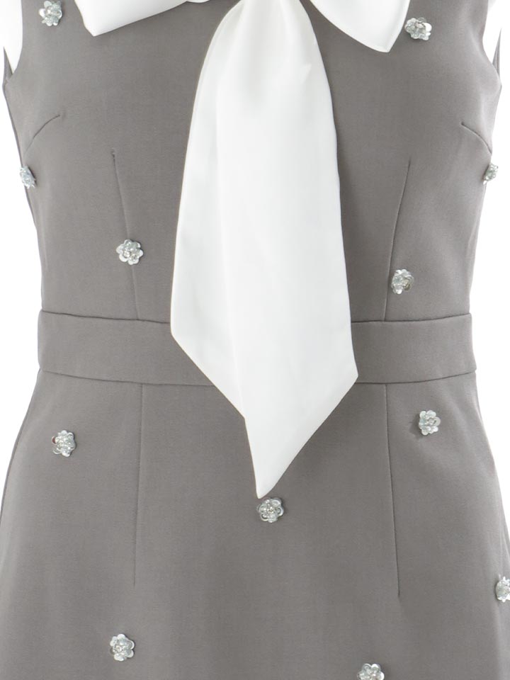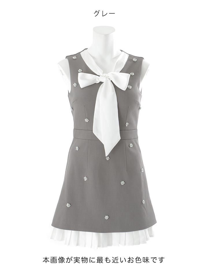 粒ビジューのきらめきとトレンドの韓国っぽさを掛け合わせたミニドレス。 胸元のボウタイリボンとスカート裾のフリルが華やかさをプラス。 スーツライクな生地で甘さとクールさを絶妙にMIXした一着。