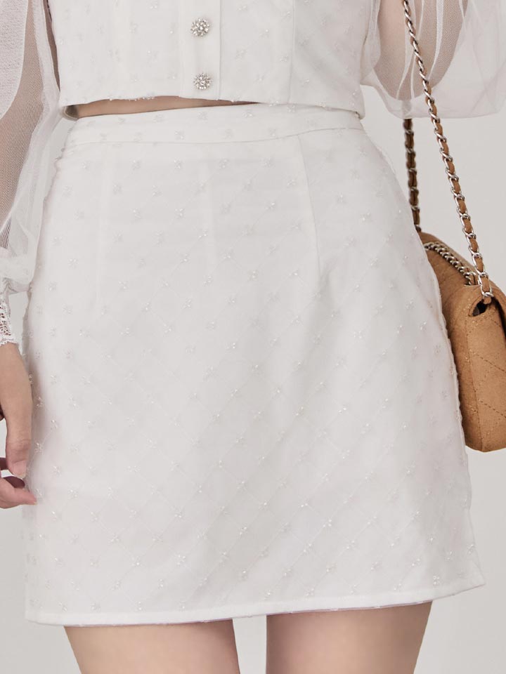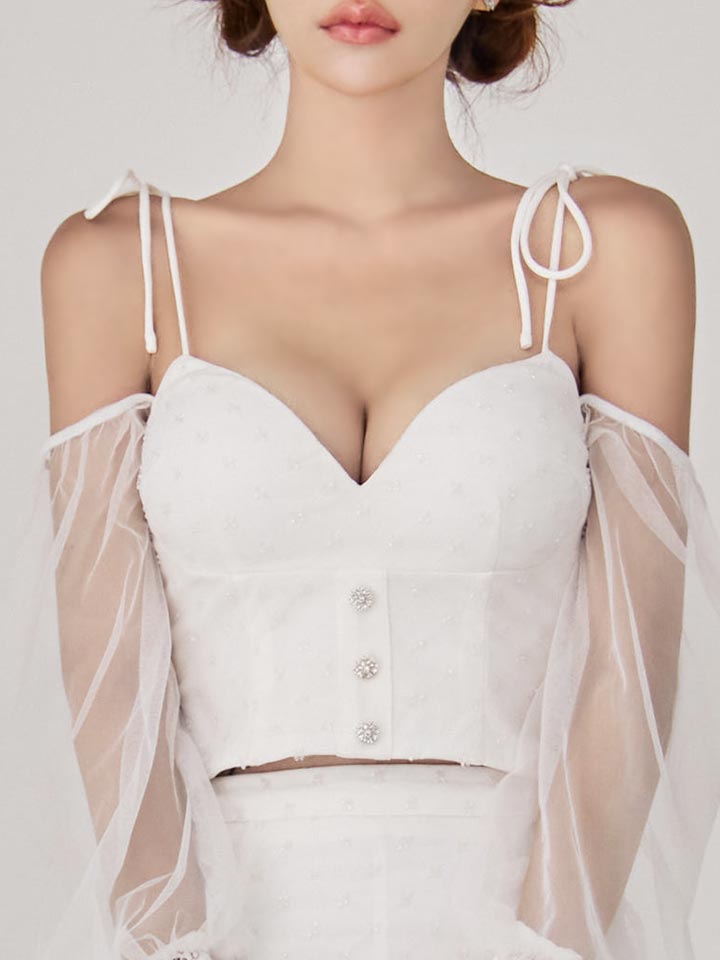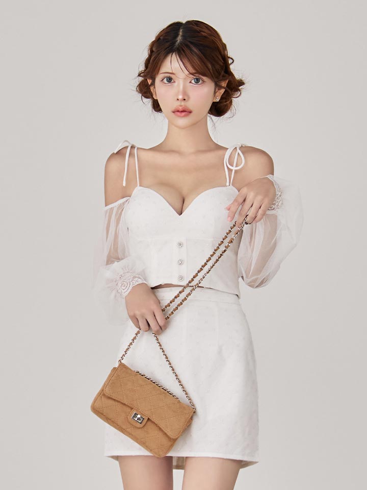 繊細なレースが大人の可愛らしさを引き立て、トップにはビジューボタンが華やかなアクセントに。