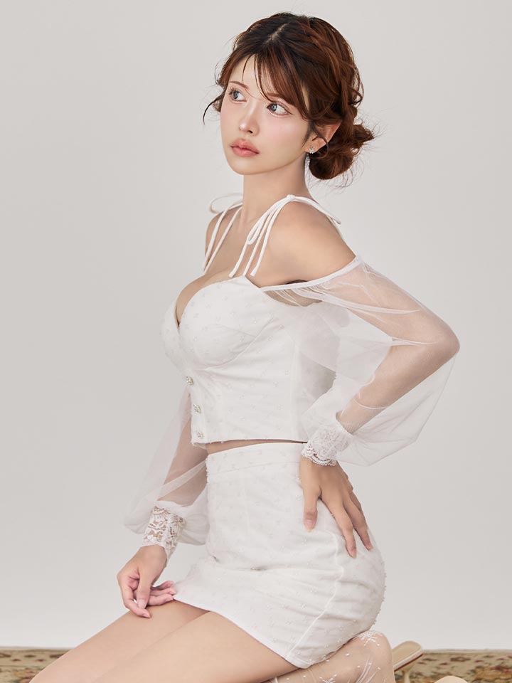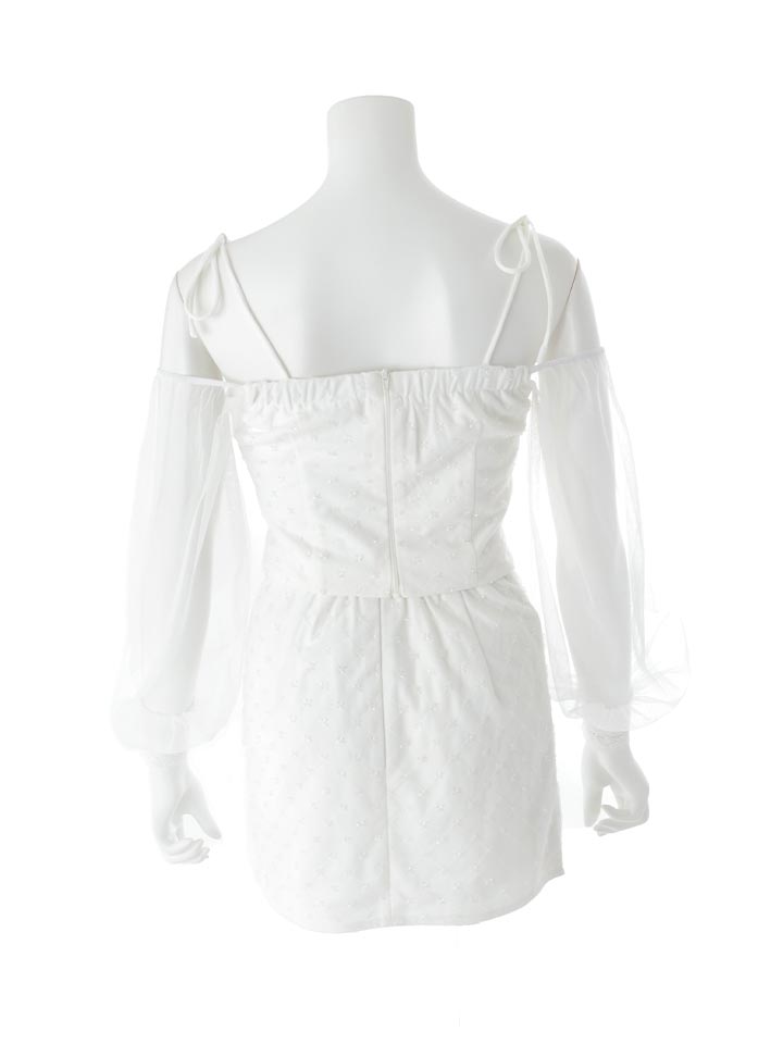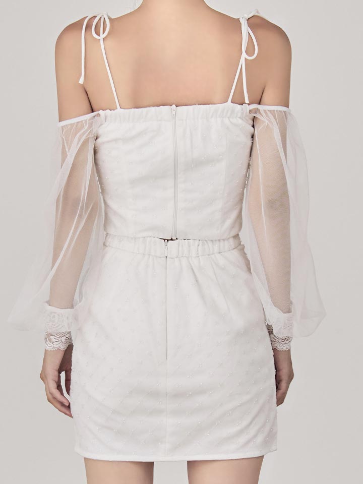 オフショルダー×シアースリーブで抜け感を演出する上品なセットアップドレス。