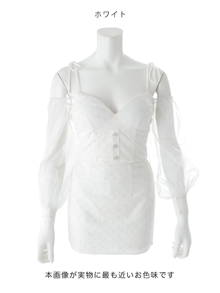 肩紐のリボンが愛らしさをプラスし、長袖デザインで気になる部分をさりげなくカバーします。