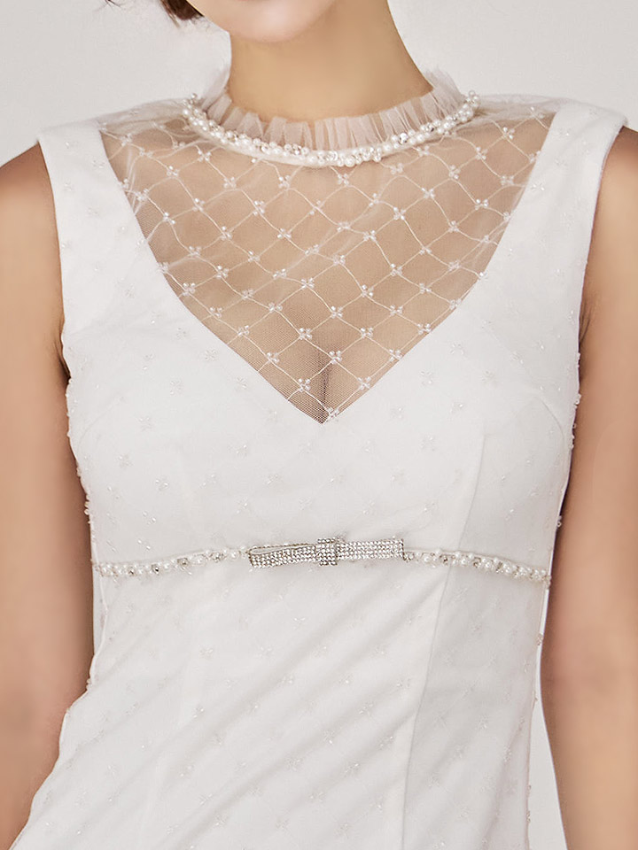 胸下のリボンビジューが上品なアクセントになり、タイトなシルエットが女性らしいラインを美しく際立たせます。