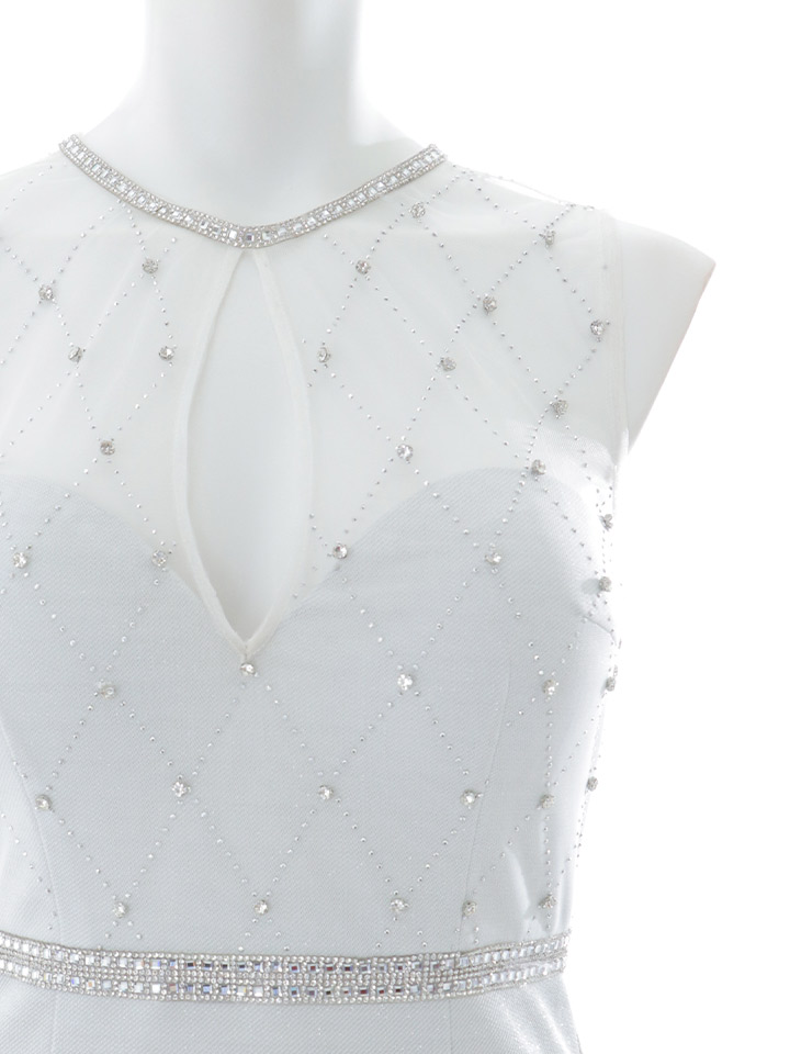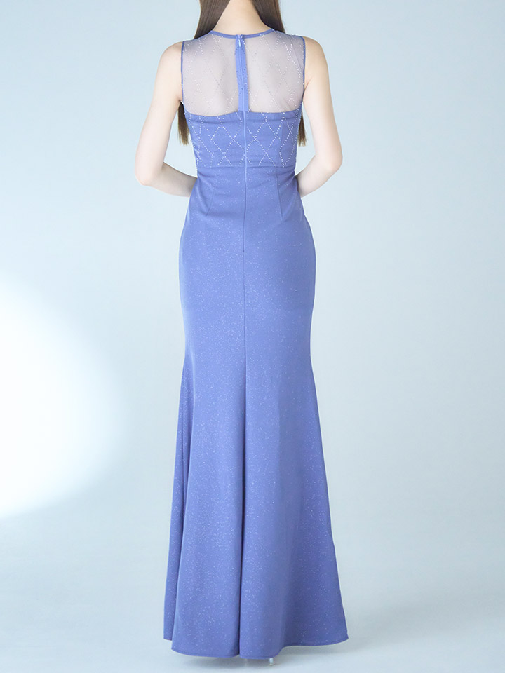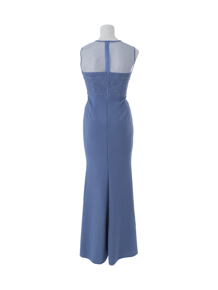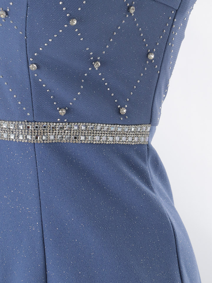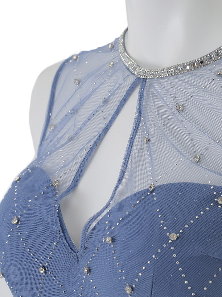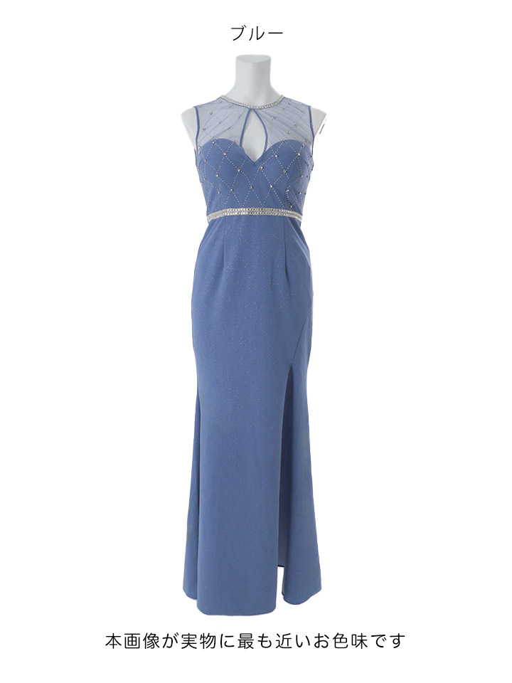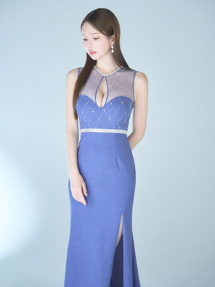 華麗な色合いの大人ブルーに大粒ビジューがキラキラ輝く主役級な一着。