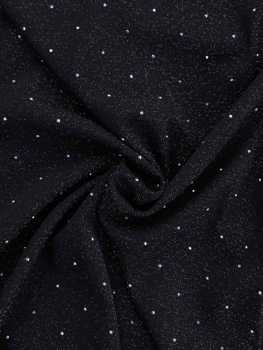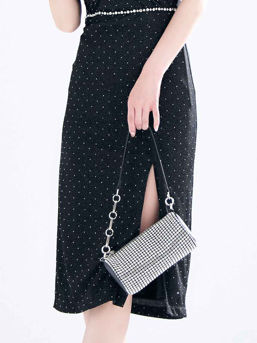 キラキラのラメ生地にスタッズが輝く、大人っぽさに可愛さをミックスしたミディアムドレス。