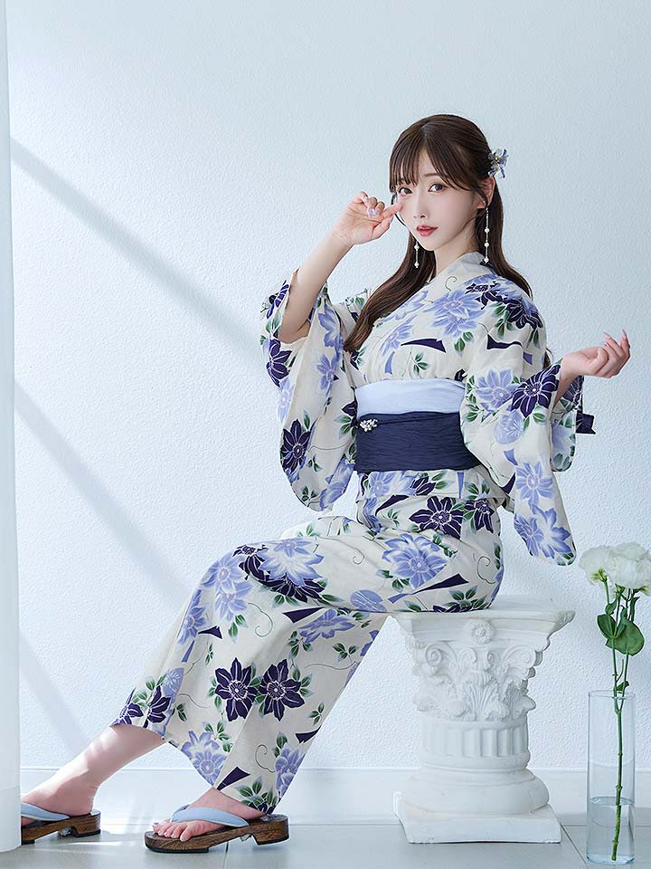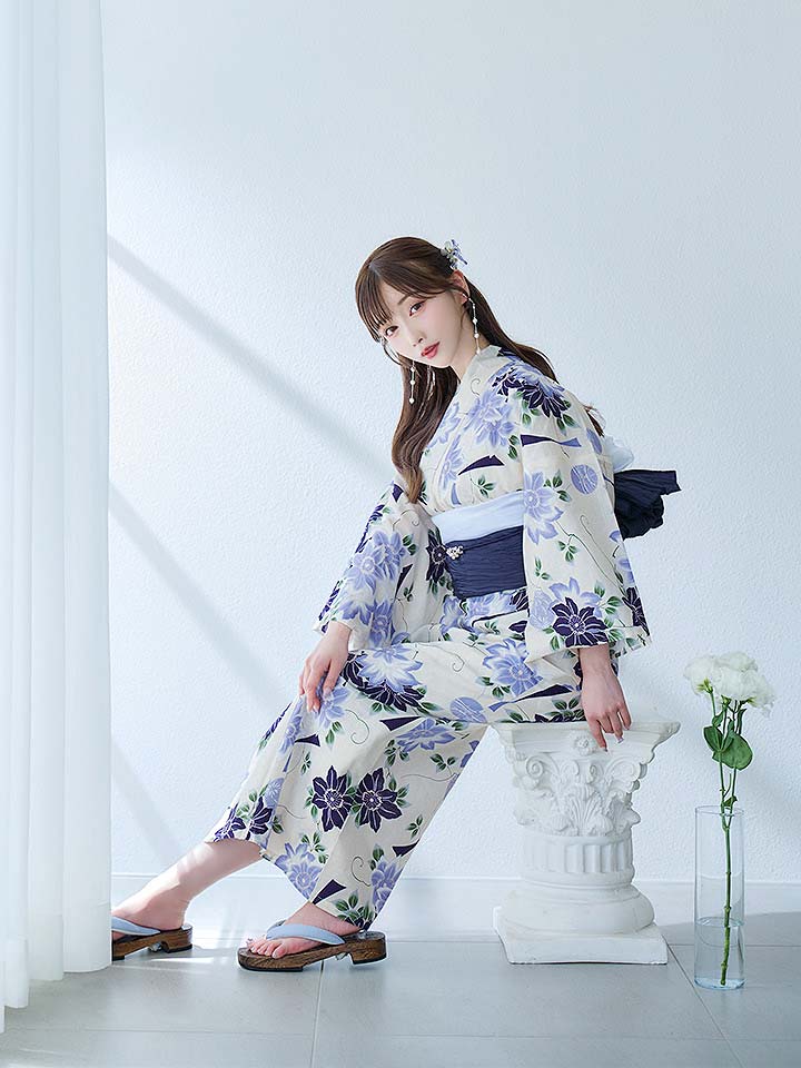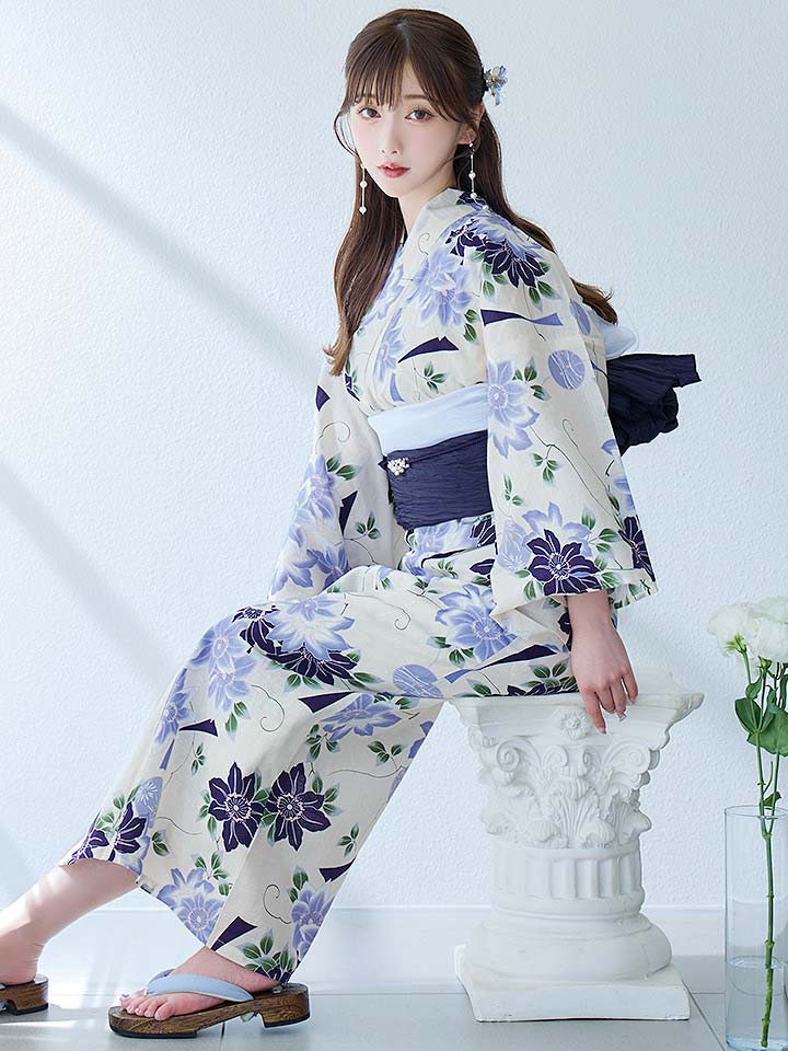 【即日発送】白地に凛と咲くクレマチス柄浴衣 【浴衣3点セット 浴衣/帯/下駄】[YMT]