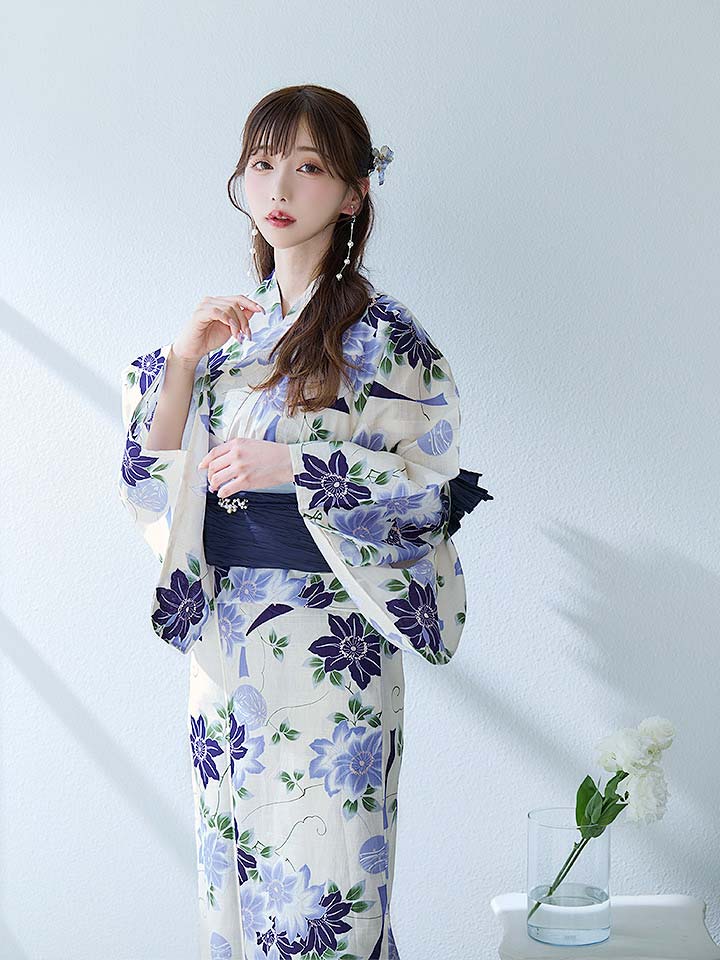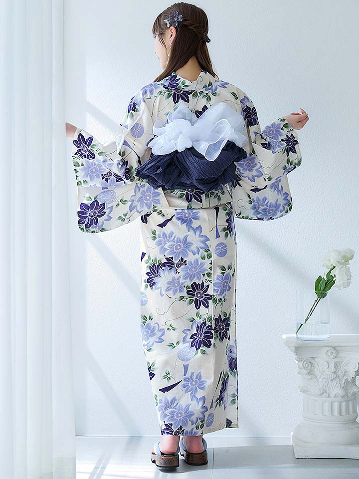 【即日発送】白地に凛と咲くクレマチス柄浴衣 【浴衣3点セット 浴衣/帯/下駄】[YMT] [Y-9046-wk-W-F-24RC-2]