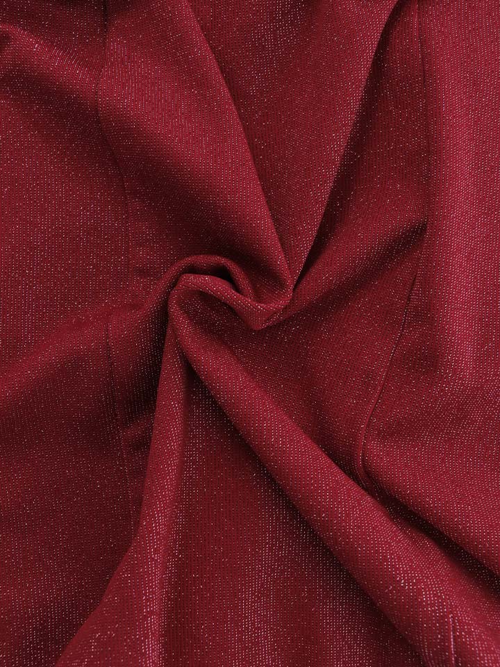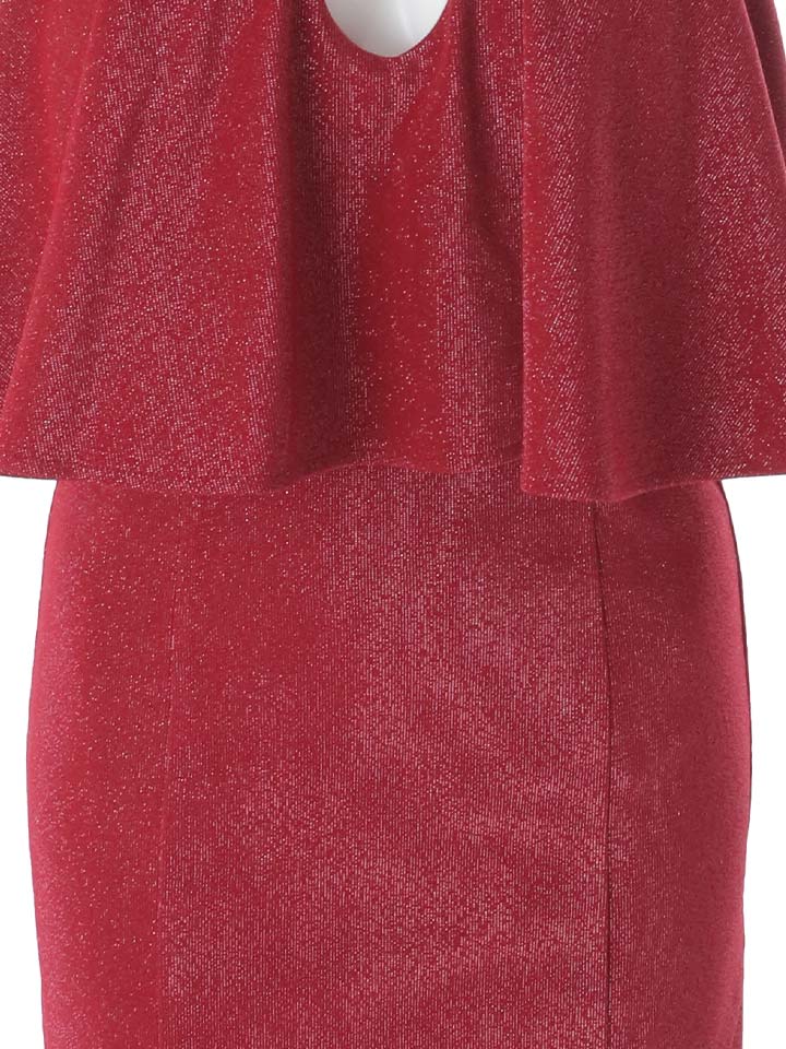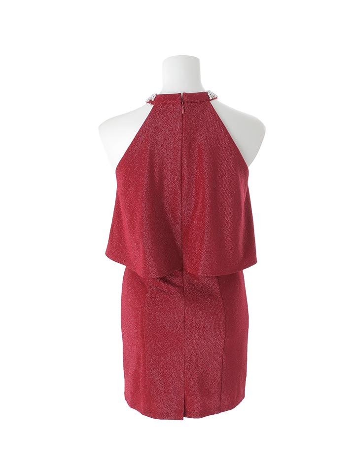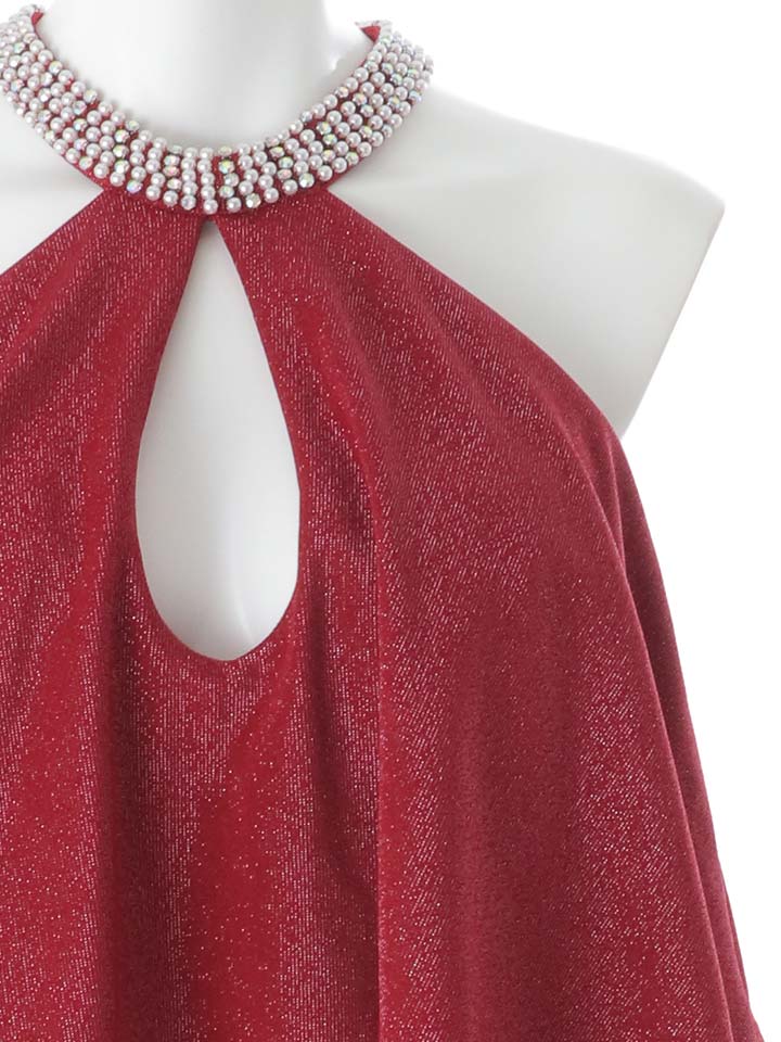 首元のビジューが顔まわりを華やかに彩り、キラキラと輝くラメ生地が存在感を放つタイトドレス。