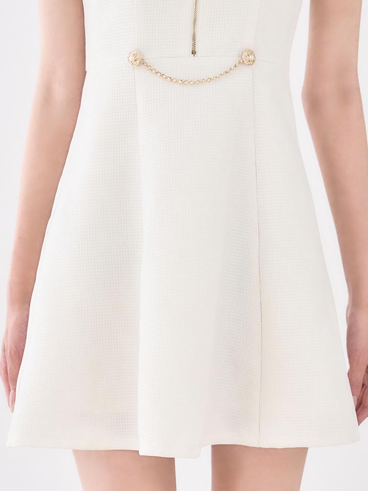 ウエストにはパールボタンとチェーンをあしらい、上品な華やかさをプラス+
