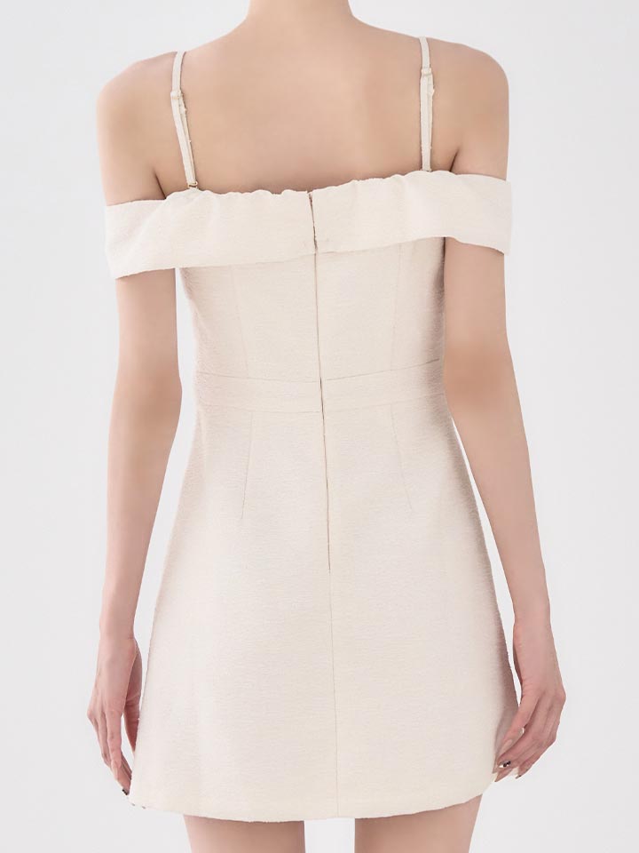 オフショルの抜け感と台形スカートのシャープさを合わせたワンピースドレス。