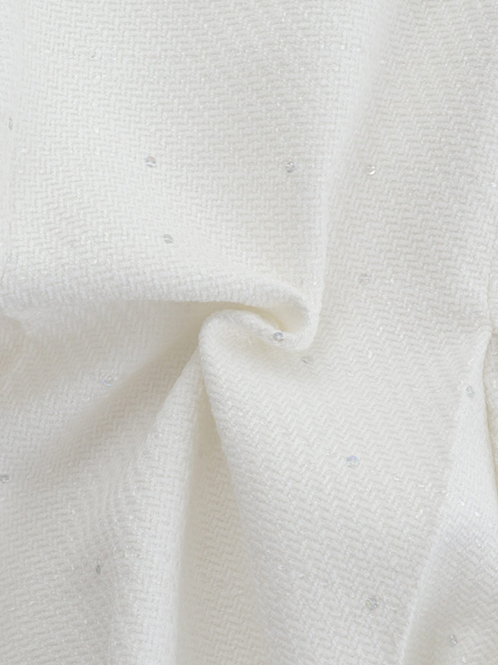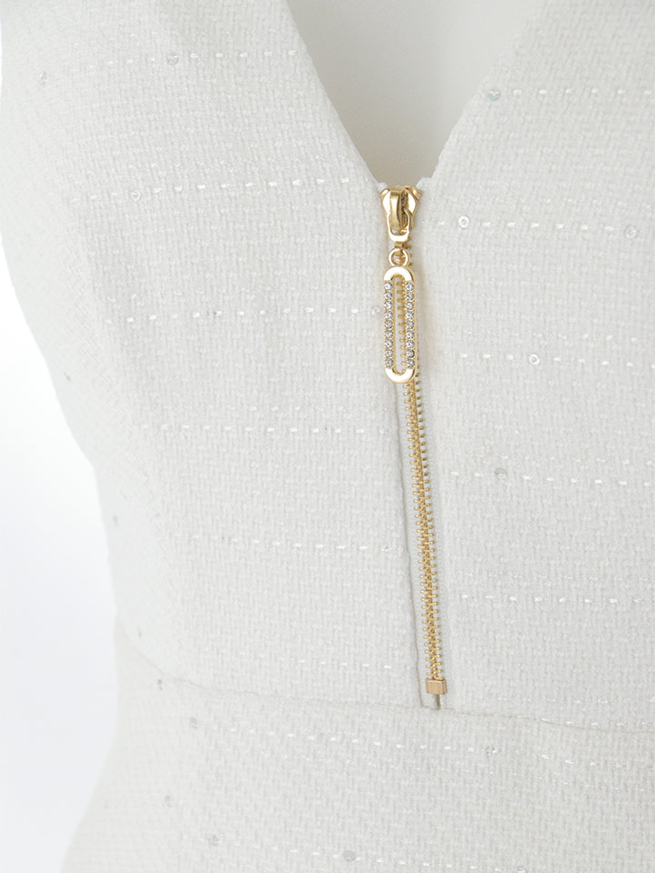 胸元のゴールドファスナーが上品な輝きを添え、シルエットにさりげない華やかさをプラス。