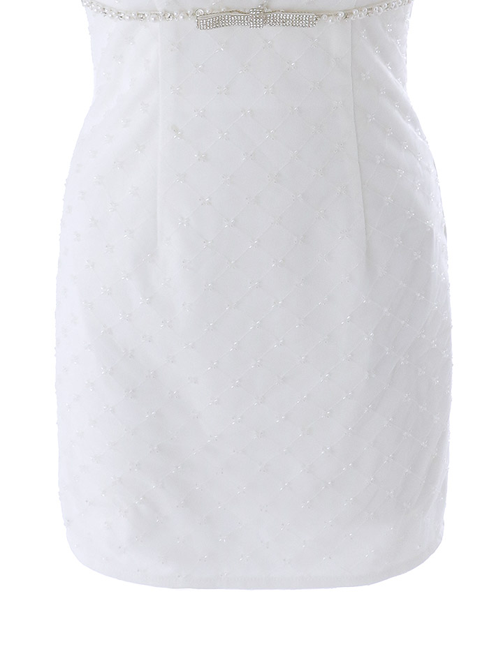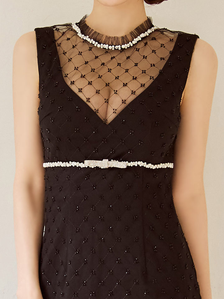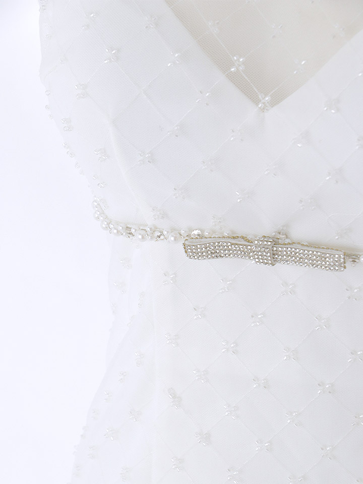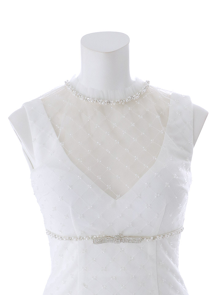 胸下のリボンビジューが上品なアクセントになり、タイトなシルエットが女性らしいラインを美しく際立たせます。