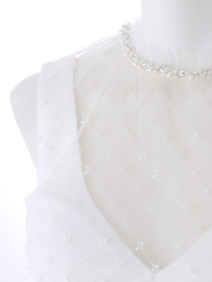 胸元のシアーチュールがほんのり肌を透かし、繊細なレースが愛らしさを引き立てるワンピースドレス。