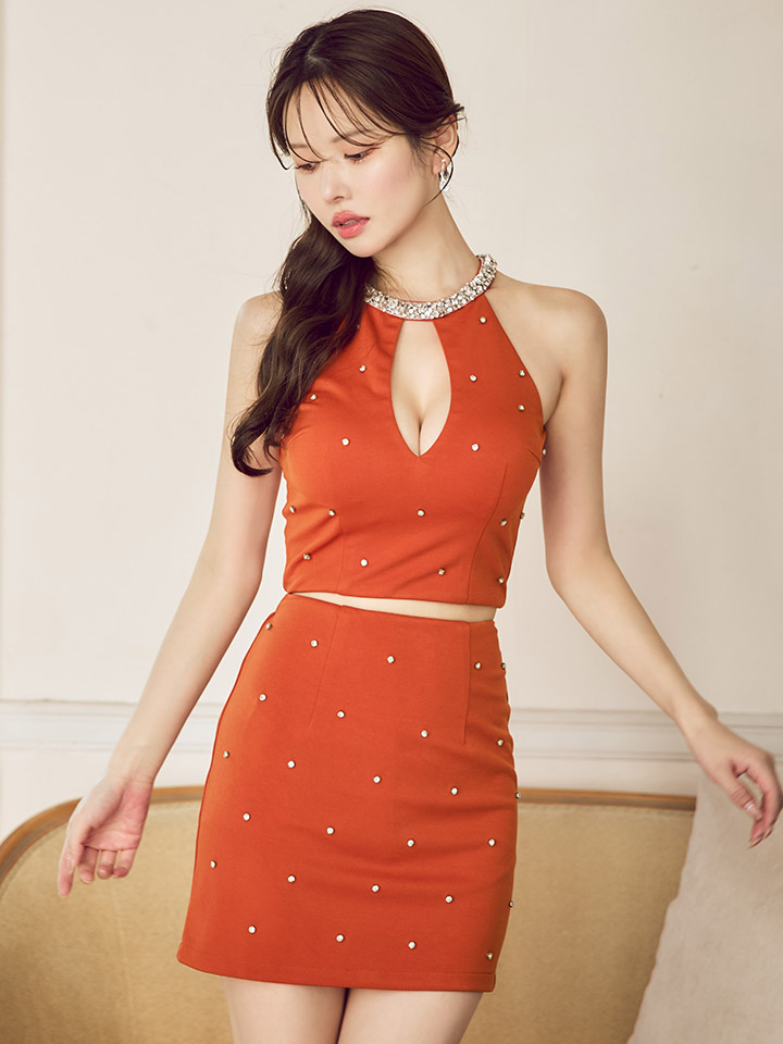 ホルターネックに煌びやかなビジューをあしらったセットアップミニドレス。