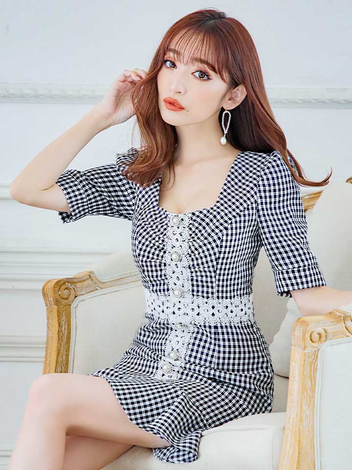 ギンガムチェックにパールボタンがガーリーな可愛さ溢れるミニドレス♡
