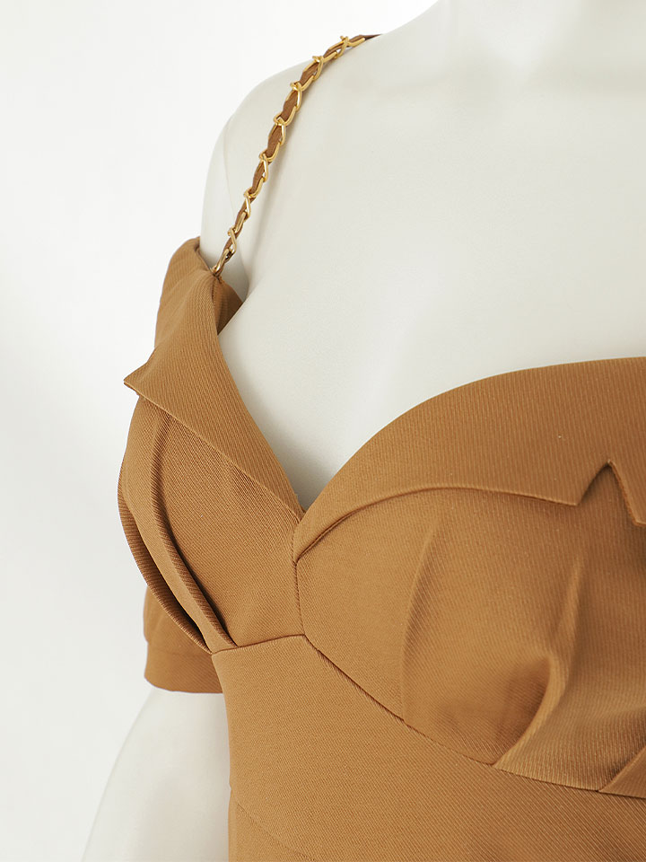 タイトスカートがしなやかなシルエットを描き、胸元のデザインで谷間を上品に魅せます。