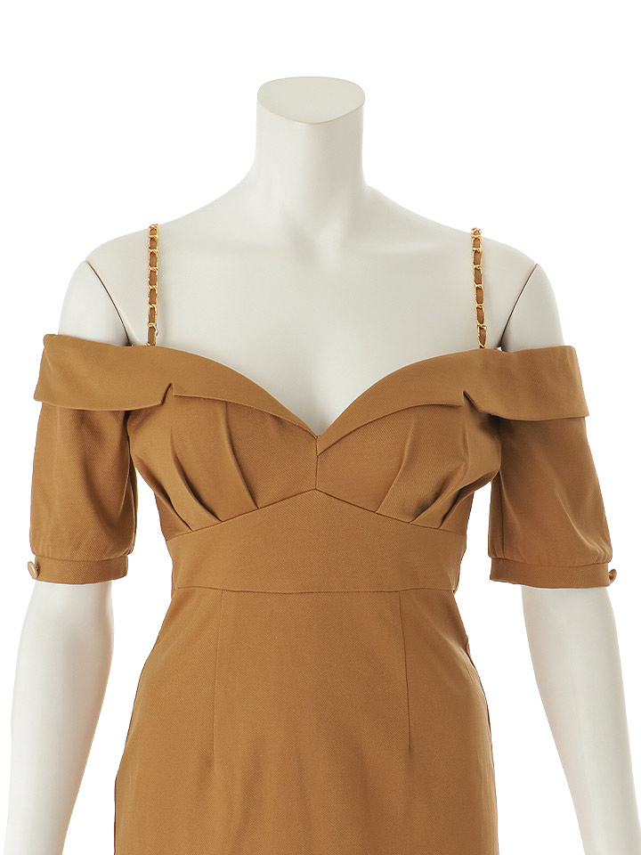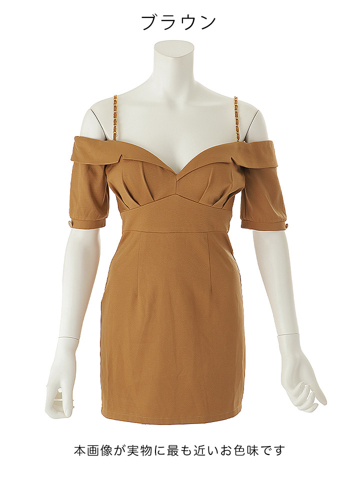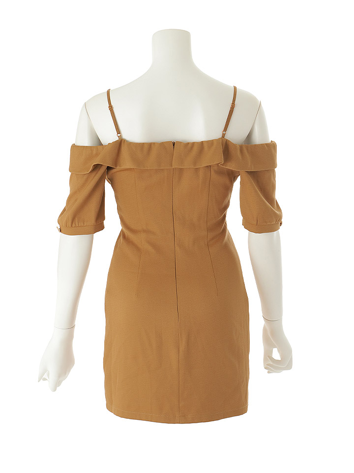 オフショルダーがデコルテを美しく引き立てるミニドレス。