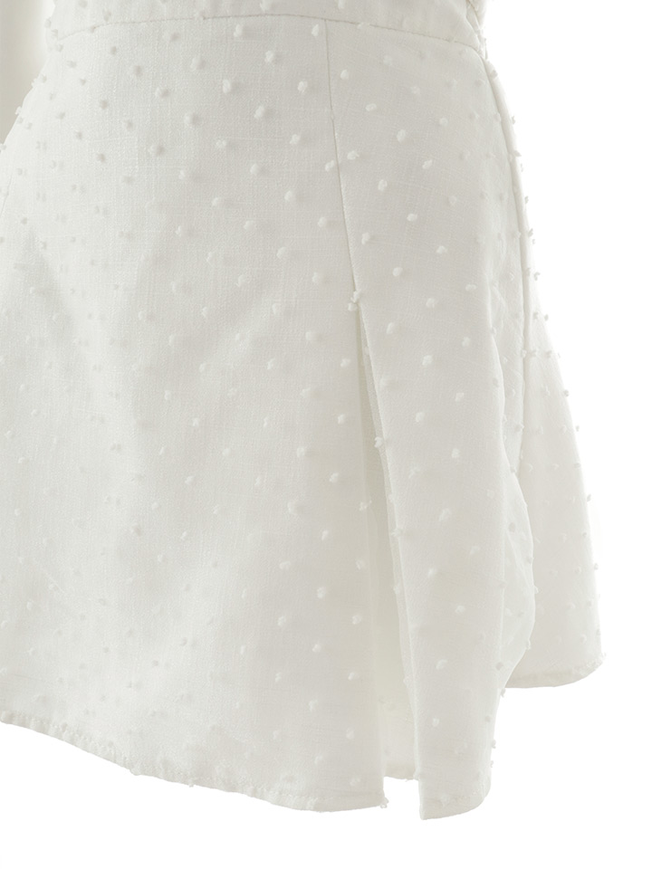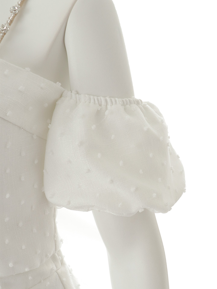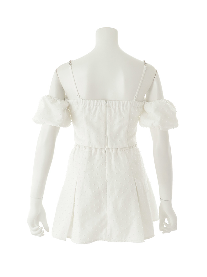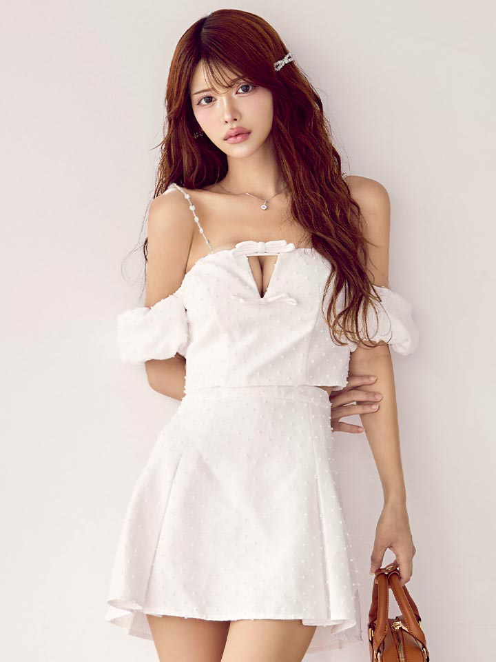 オフショルダーのパフスリーブがフェミニンな雰囲気を漂わせる2ピースのミニドレス。