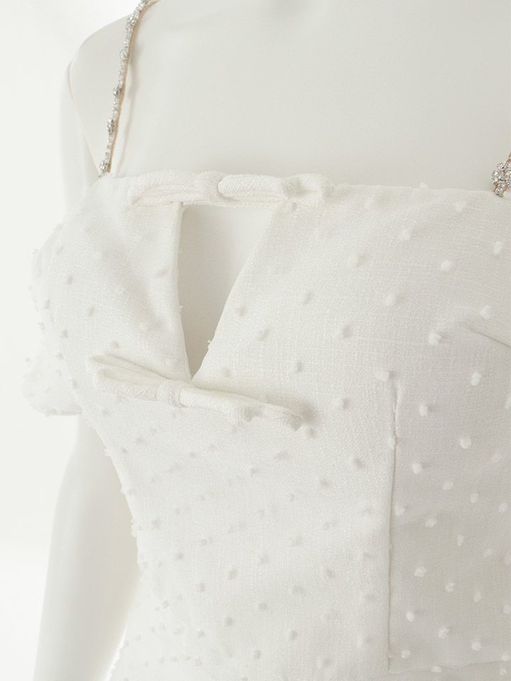 ビジューの肩紐がきらめきを添え、ボックスプリーツが揺れるたびに華やかさをプラス。