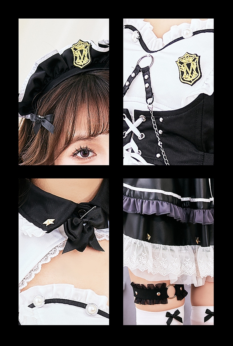 カチューシャ・髪飾り・トップス・ベスト・ボレロ・フロントリボン・スカート・手袋・太もも飾り・ニーハイソックス・チェーン4本・ワッペン3個・透明ストラップ・バックリボン