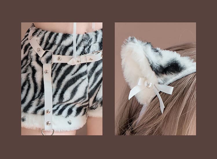 トラ タイガー とら 虎 ファー ふわふわ セットアップ 2ピース セットアップ アニマル コスプレ かっこいい セクシー かわいい 可愛い レースアップ ベルト 耳付き カチューシャ ホワイト 白色 アニマル柄