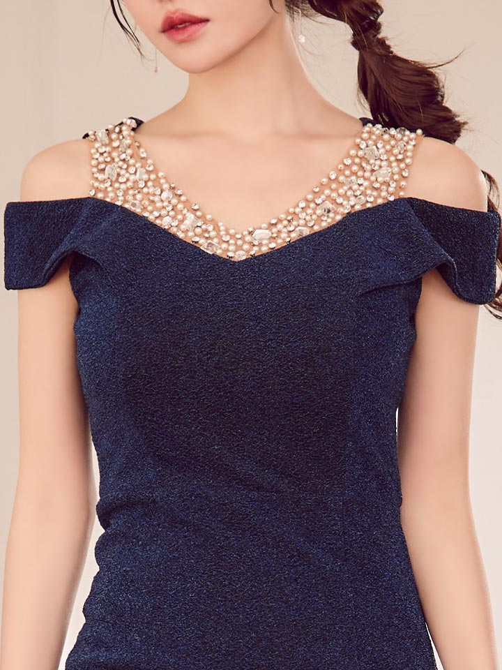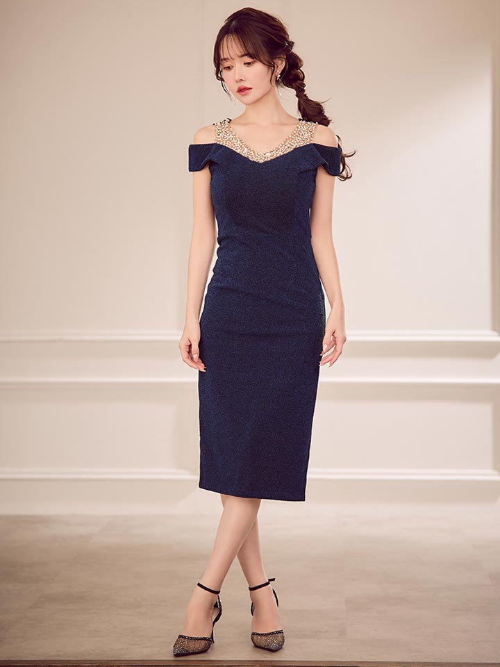 送料無料!ラメビジューショルダーサイドスリットミディアムドレス/キャバドレス【IM】【S-Lサイズ/2カラー】[OF03B]