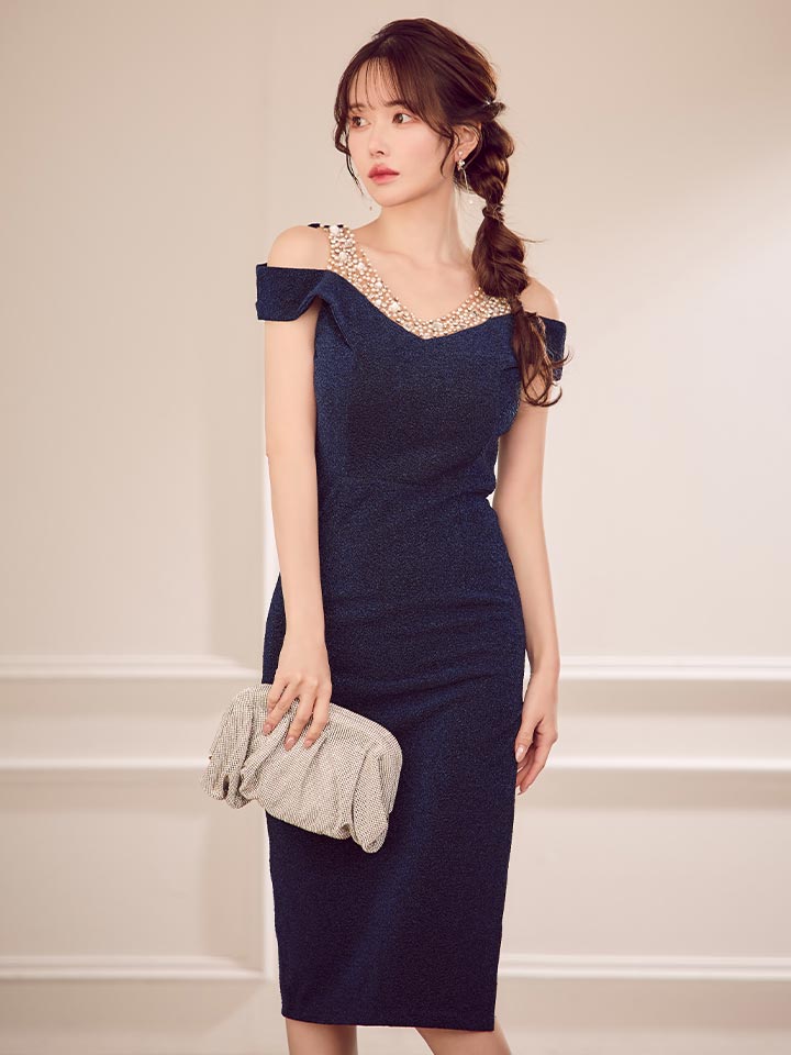 オフショルデザインで肩やデコルテを美しく見せ、ビジューが輝きを添えて華やかさをプラス。