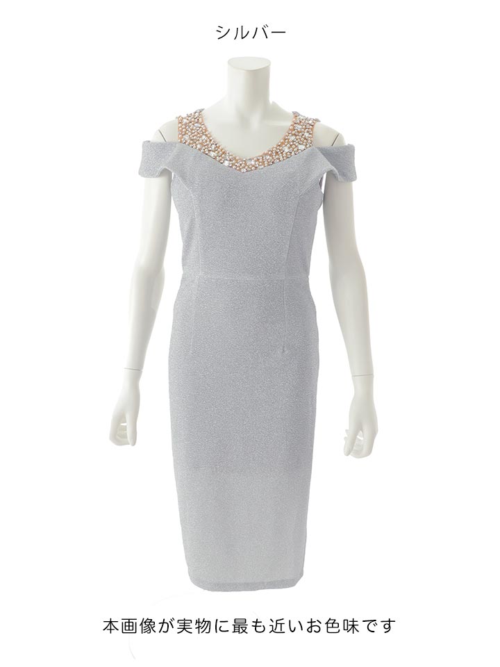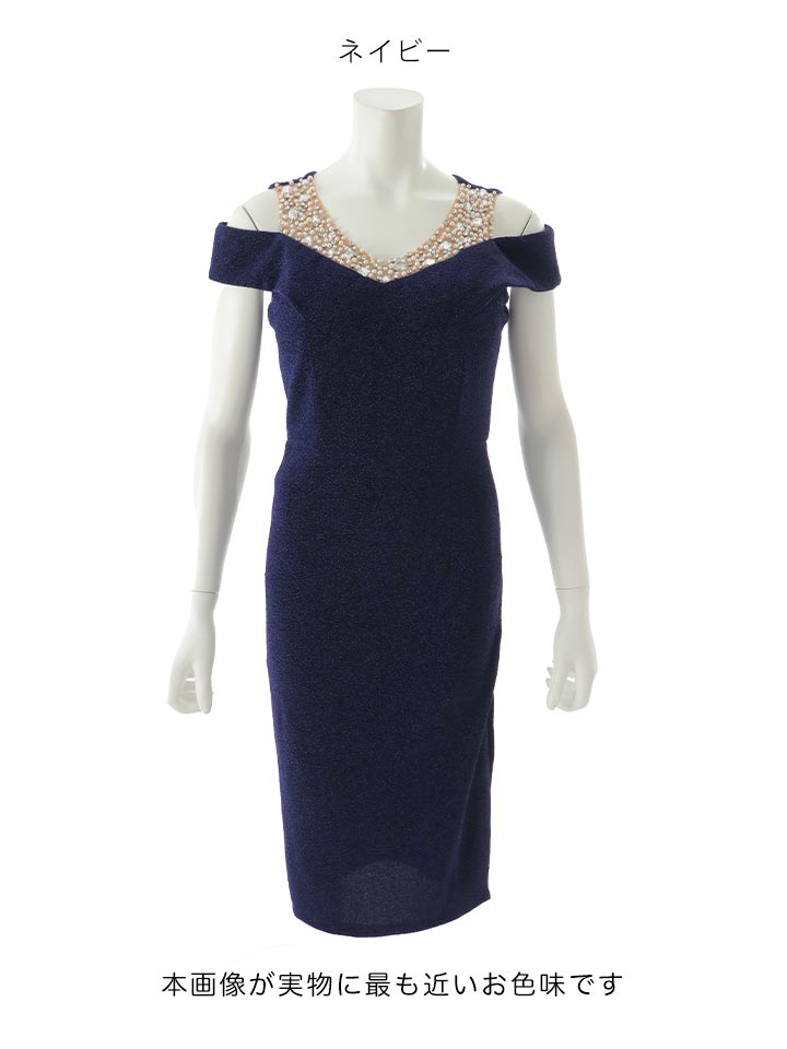 送料無料!ラメビジューショルダーサイドスリットミディアムドレス/キャバドレス【IM】【S-Lサイズ/2カラー】[OF03B]