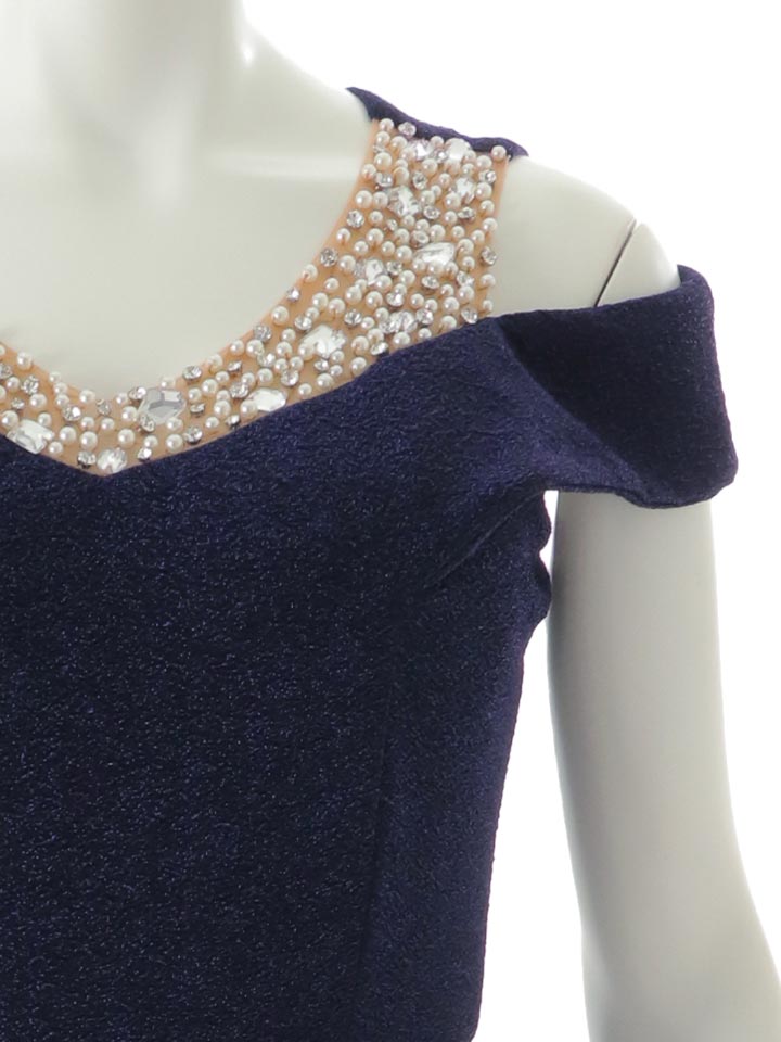 オフショルデザインで肩やデコルテを美しく見せ、ビジューが輝きを添えて華やかさをプラス。