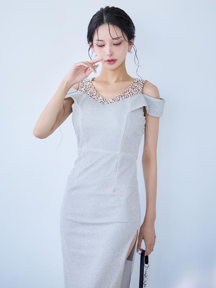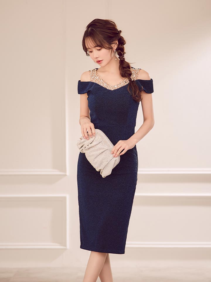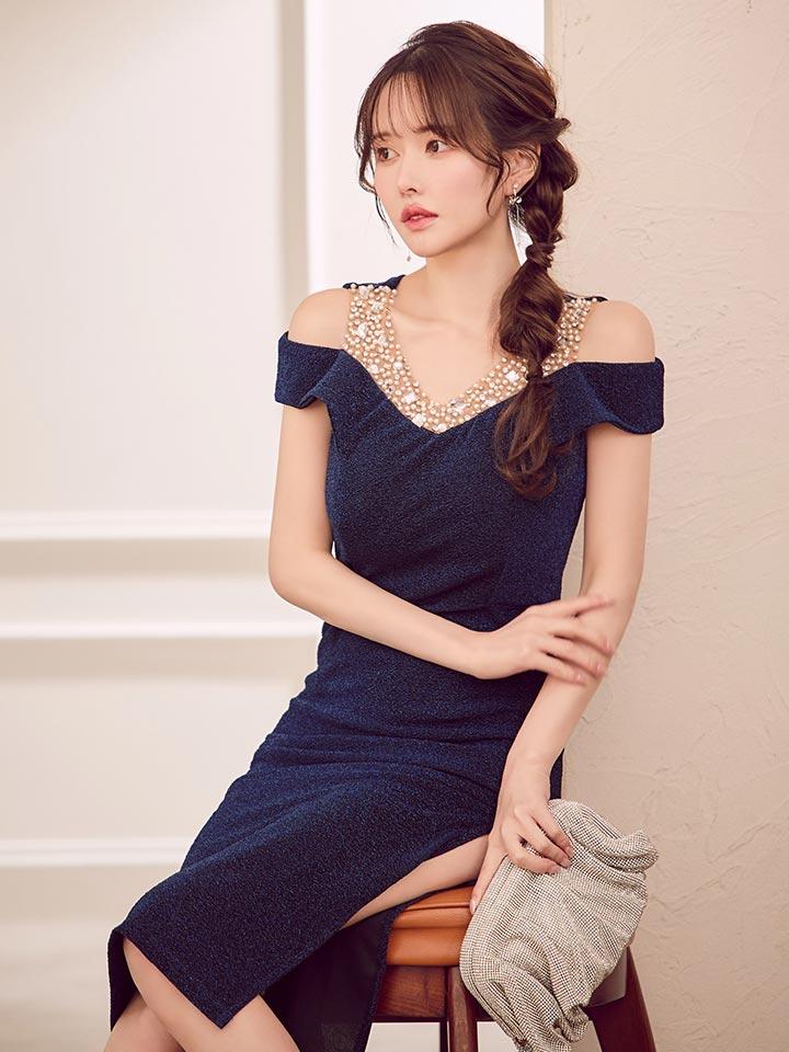 送料無料!ラメビジューショルダーサイドスリットミディアムドレス/キャバドレス【IM】【S-Lサイズ/2カラー】[OF03B] [J-972IM-250905-2]