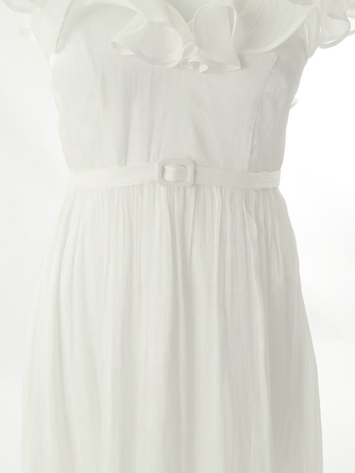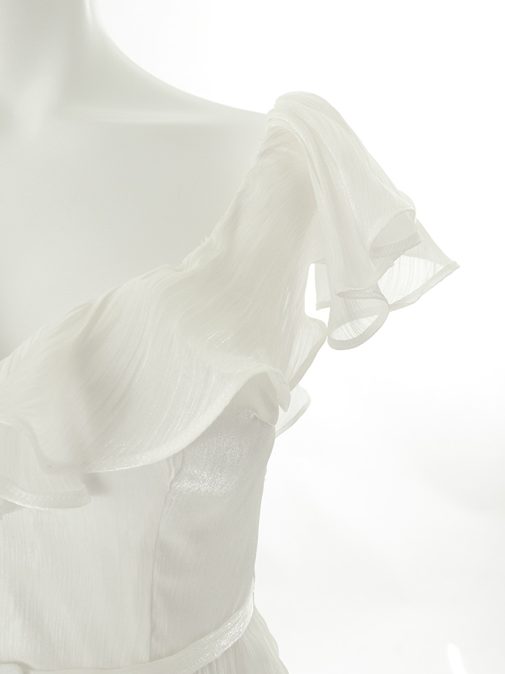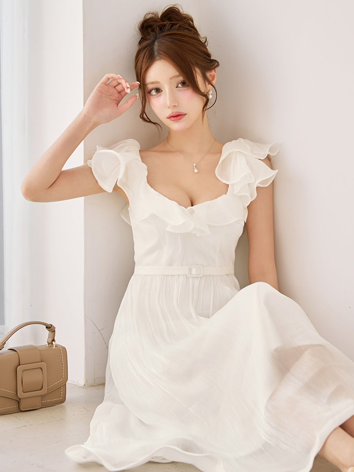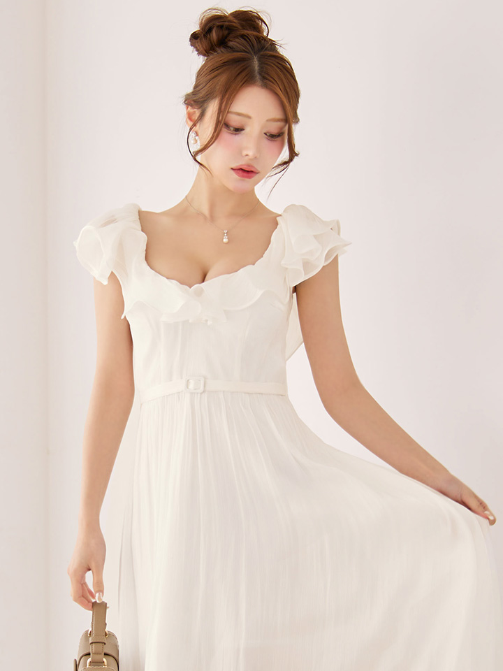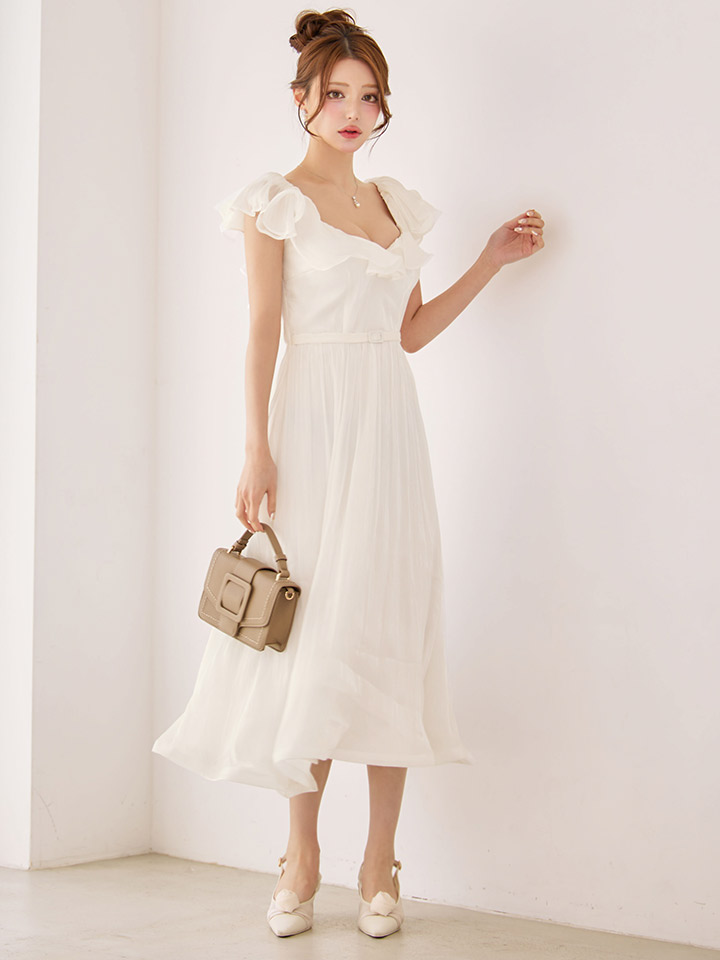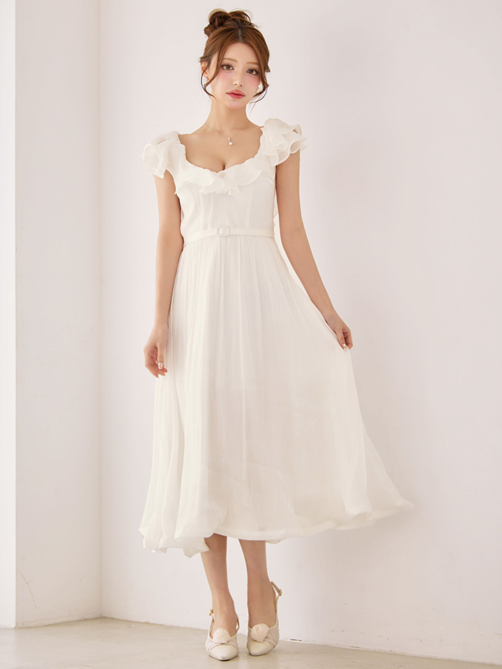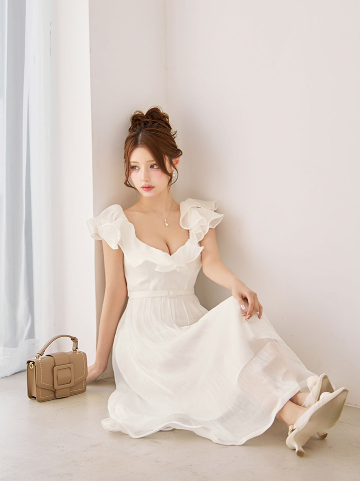 胸元のデザインで大人の魅力を引き出しながら、肩のフリルが愛らしさを添える特別な一着♡