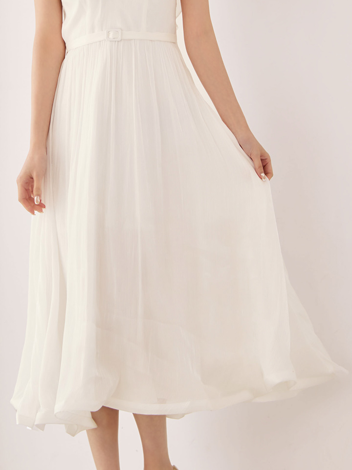 ミディアム丈のフレアスカートが気品を漂わせ、裾の柔らかな動きが軽やかさをプラス。