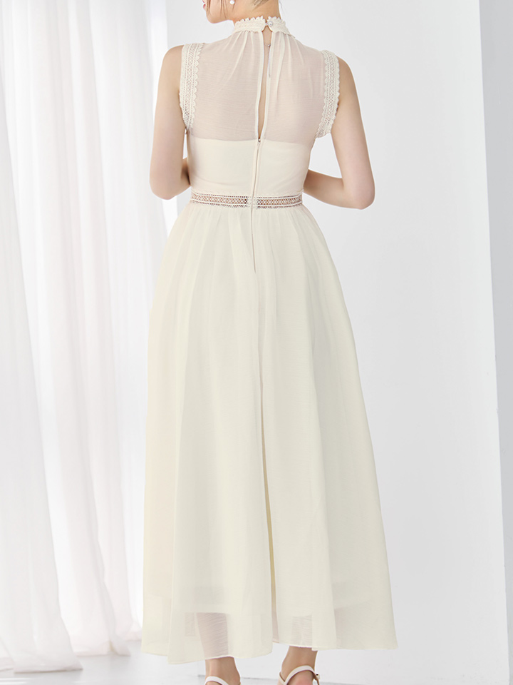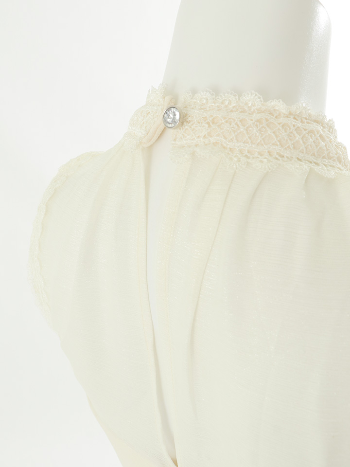 首元や袖口、ウエストにあしらわれた繊細なレースが、上品な華やかさを添えるエレガントな一着です。