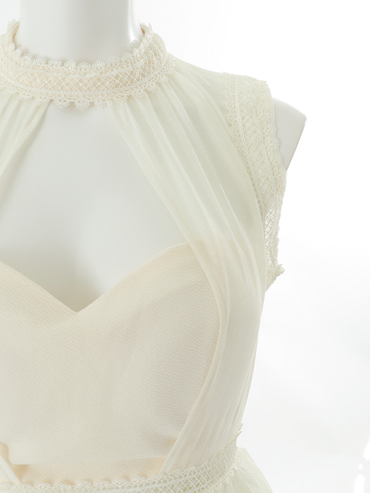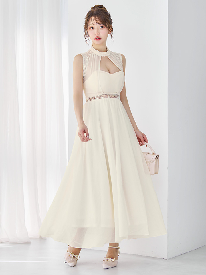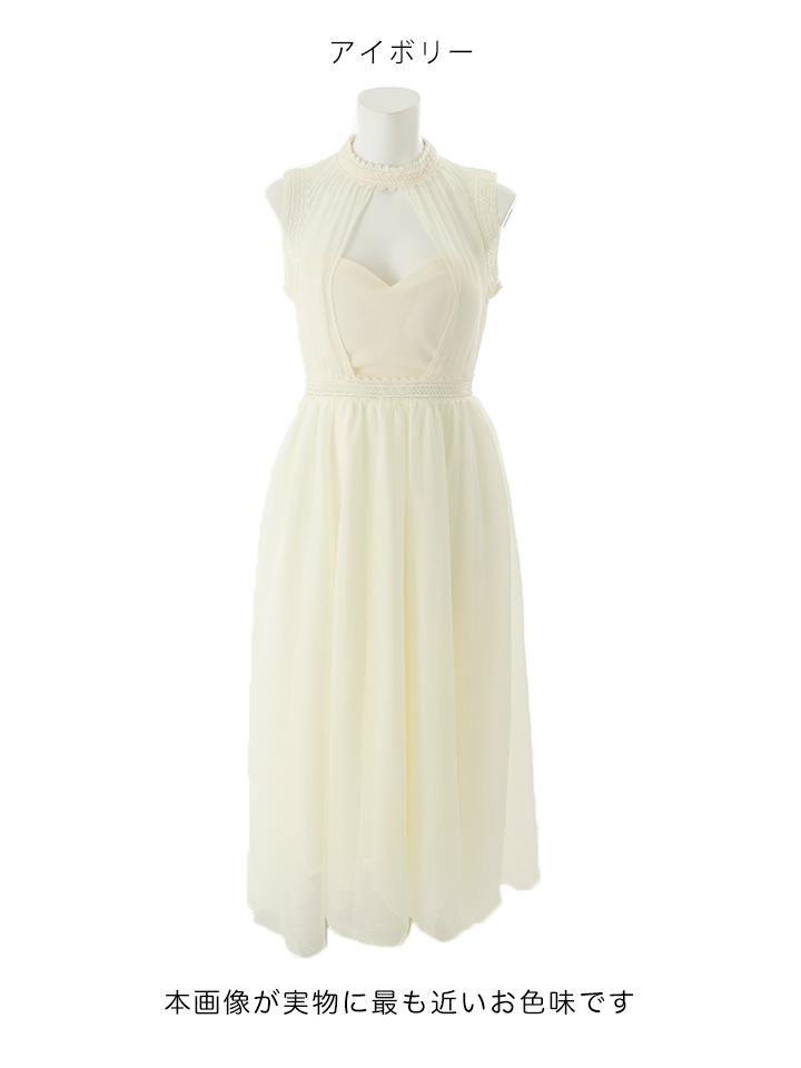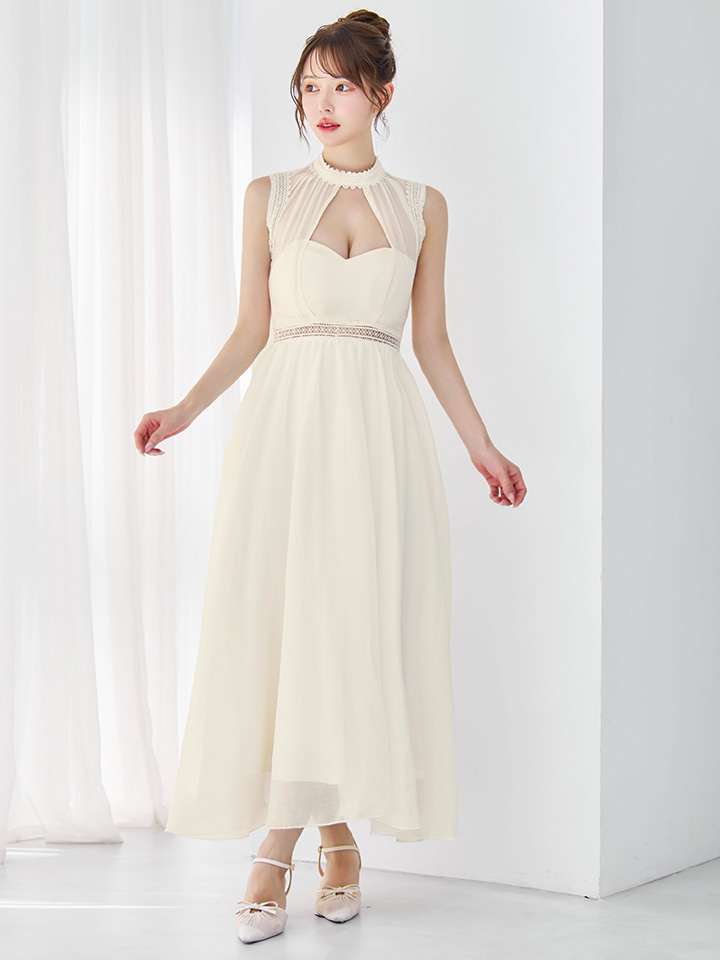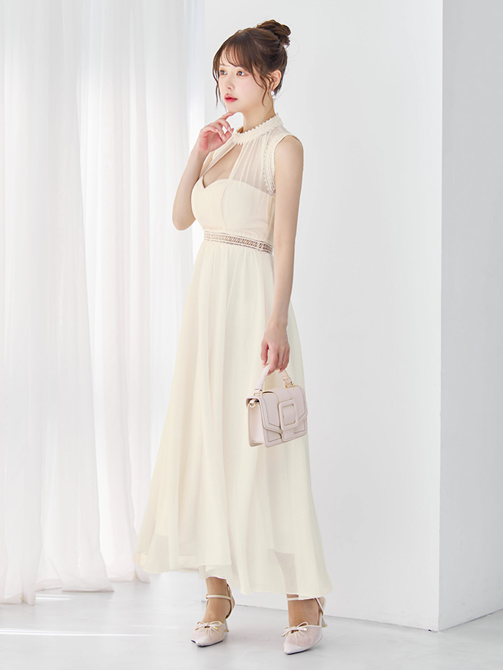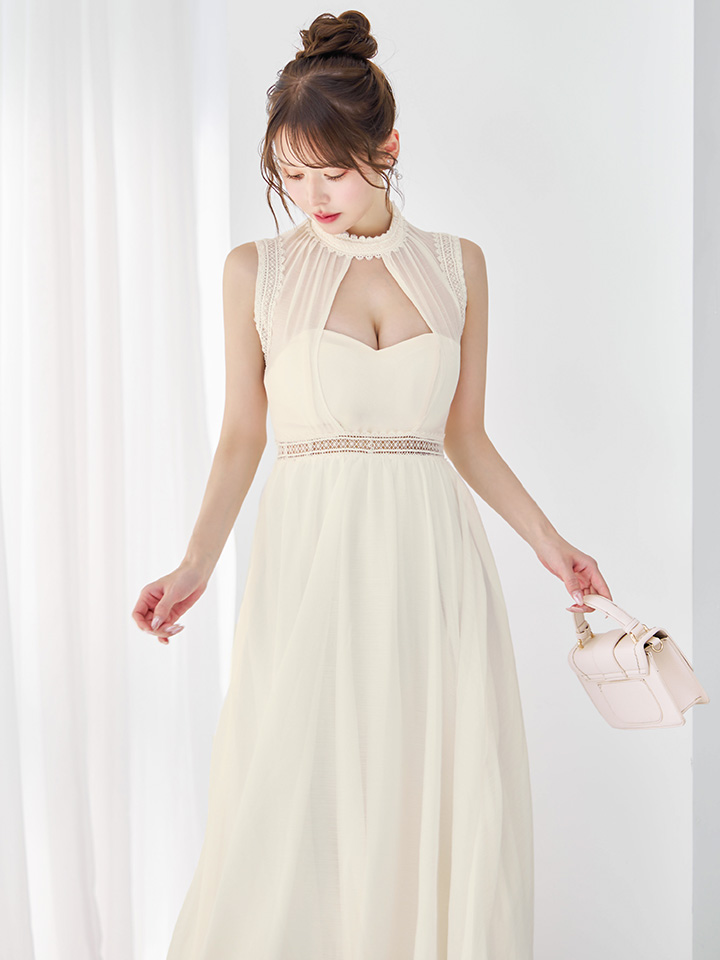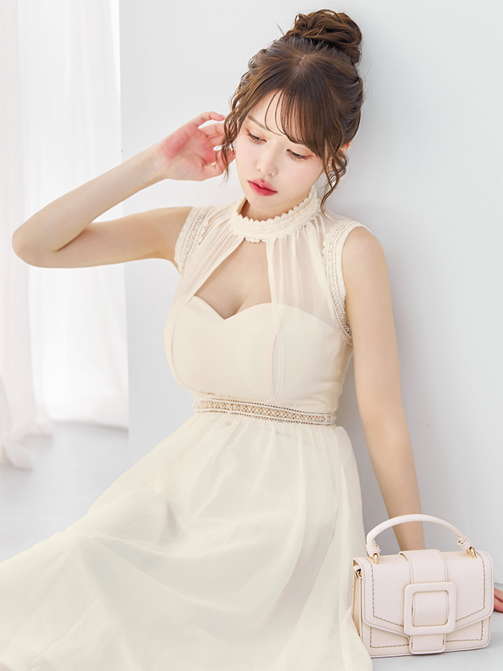 胸元にはシフォンの透け感を取り入れ、谷間を美しく演出。