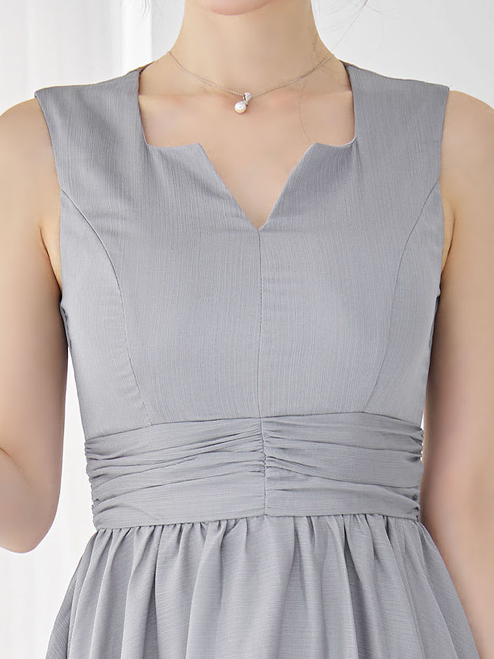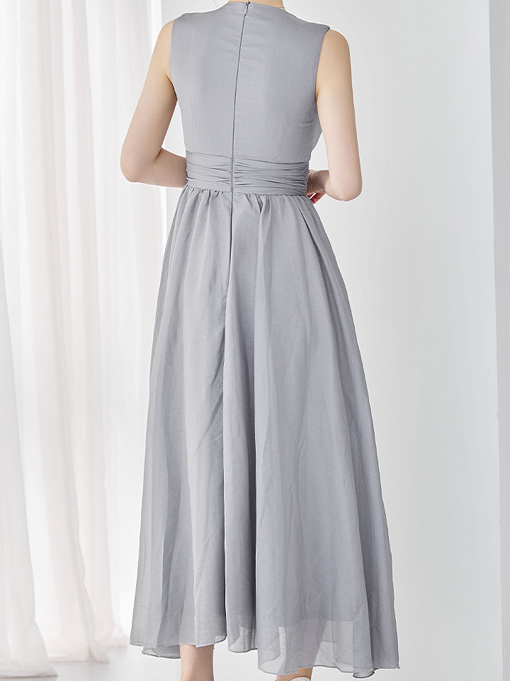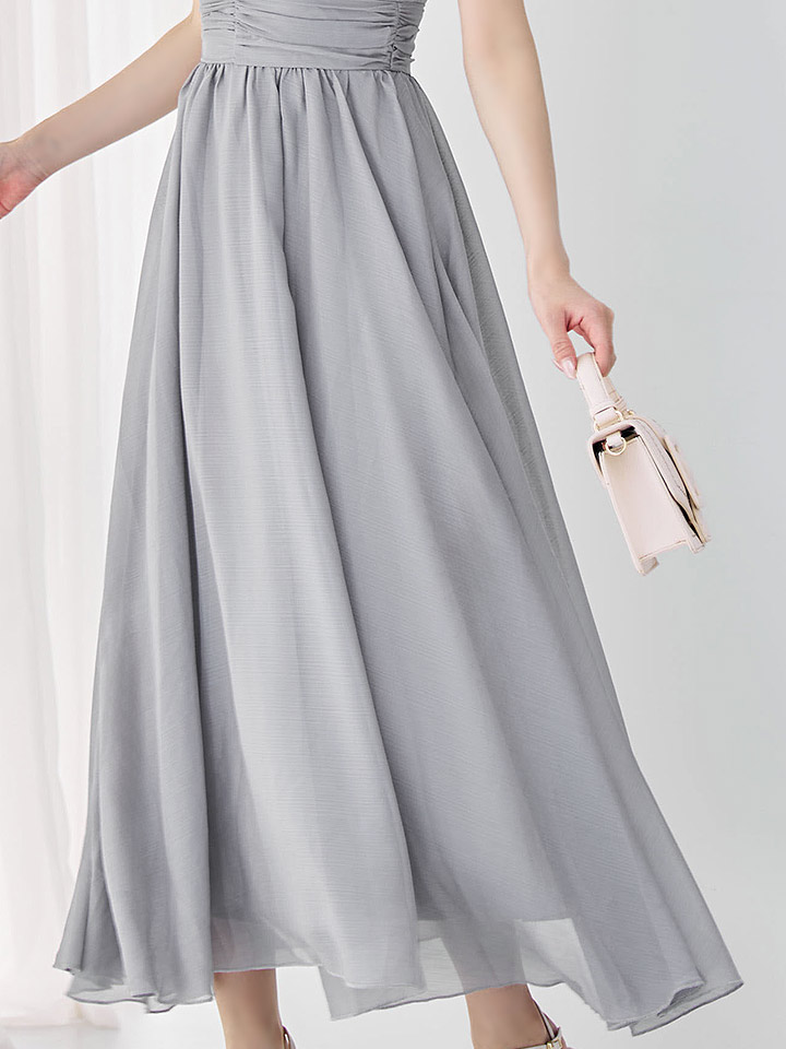 ふんわりと広がるシフォンのフレアスカートが軽やかに揺れるロングドレス。
