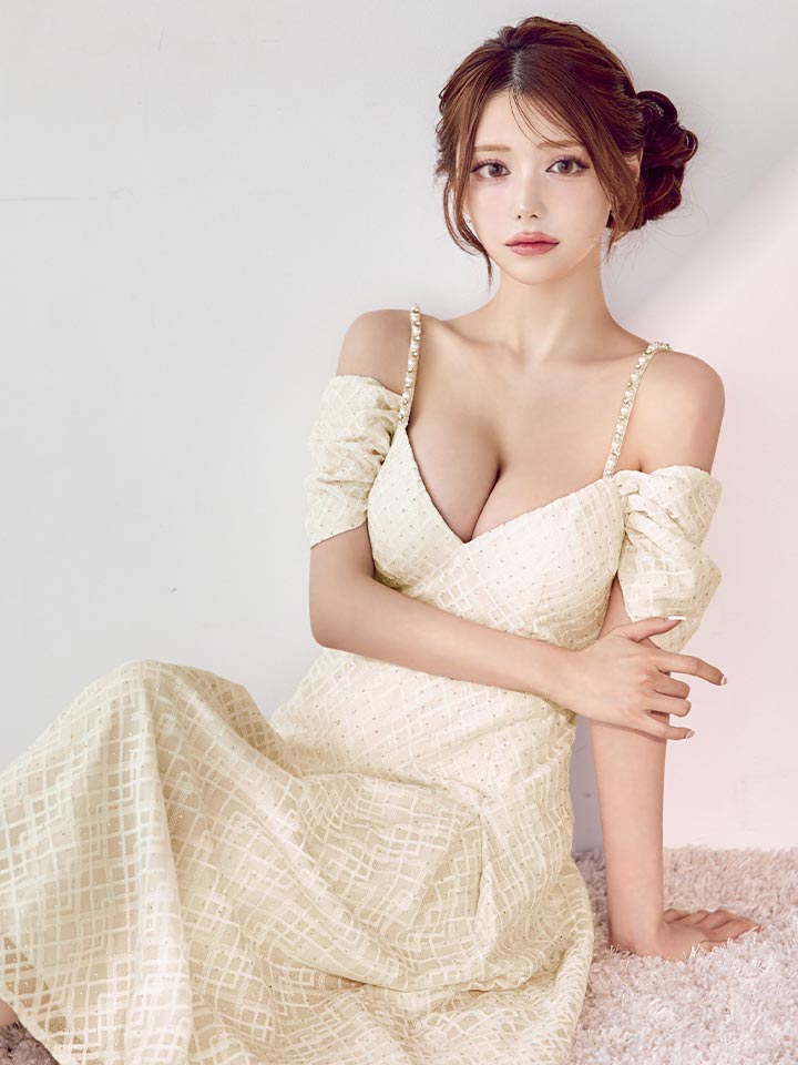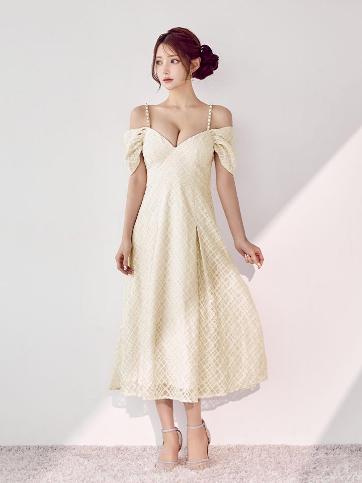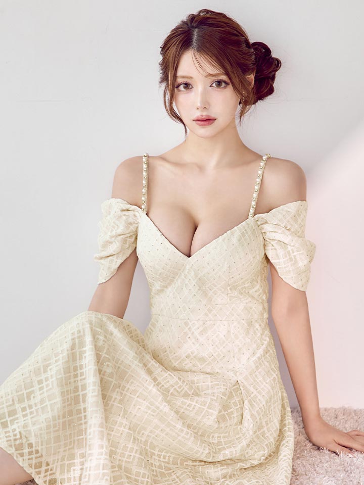 肩回りを綺麗に魅せるオフショルと谷間デザインがポイント